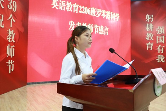 来自外语学院英语教育专业2206班的学生代表罗零露发表教师节感言。罗同学结合自己在学习和生活中的所思所想,用心抒发了尊师重教的思想感情,体现了爱国、爱校的情怀,同时也表达了汲取知识、练就本领、报效祖国的真切愿景。