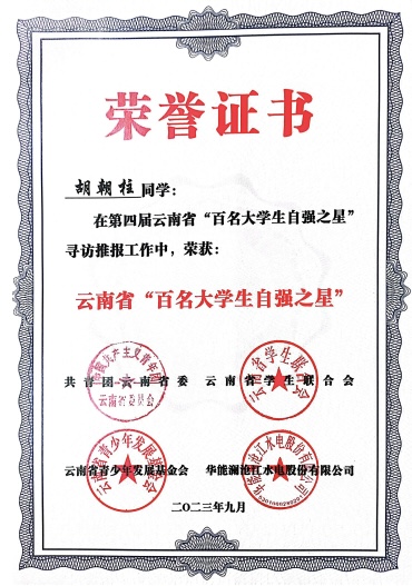 据共青团云南省委、云南省学生联合会、云南省青少年发展基金会、华能澜沧江水电股份有限公司联合开展的寻访第四届云南省“百名大学生自强之星”活动公布。伟德胡朝柱同学荣获云南省“百名大学生自强之星”称号。