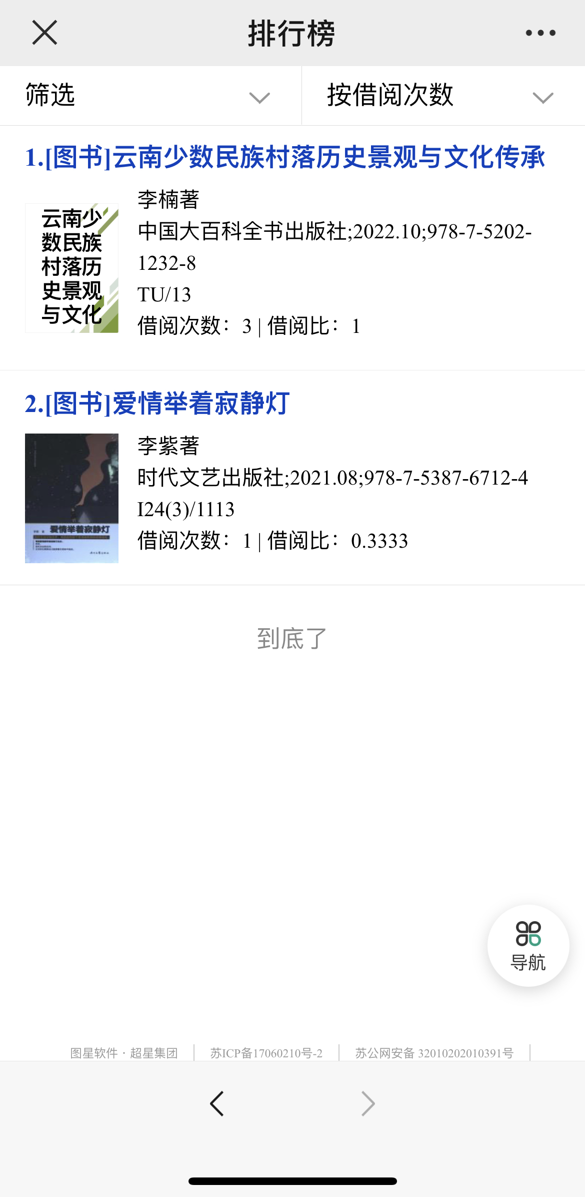 (6)借阅排行:点击“借阅排行”可查看借阅量最高的图书清单。