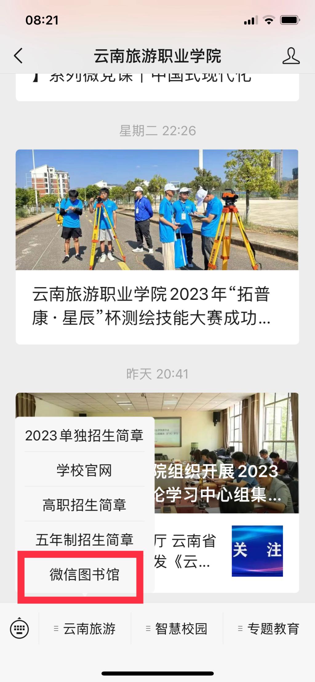 1、搜索并关注bevictor伟德国际1946官网公众号,打开公众号,点击左下角的“云南旅游” 找到“微信图书馆”。