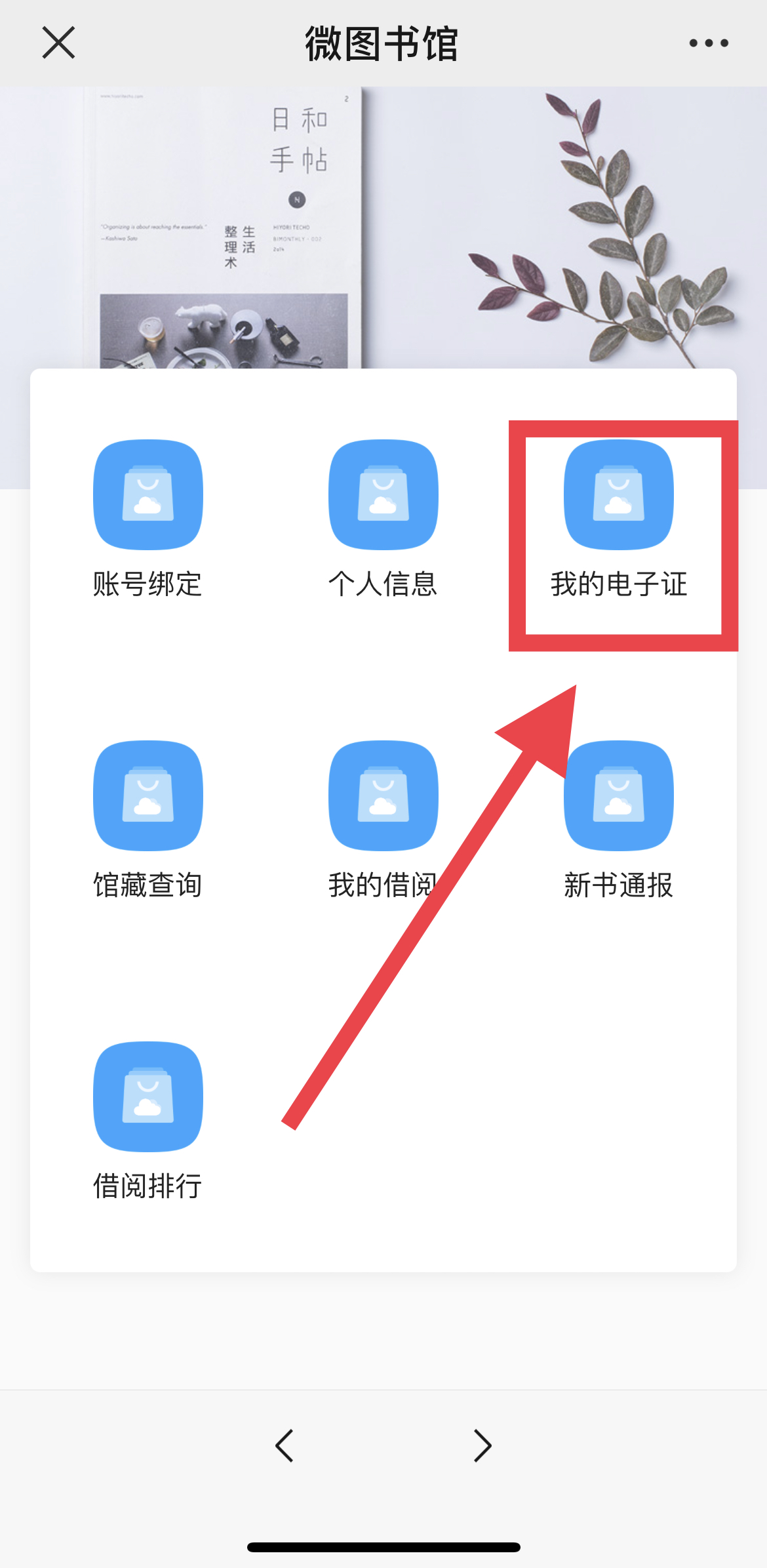(2)电子借阅证:点击“我的电子证”将出现一个二维码,使用此二维码可进行借还书操作。