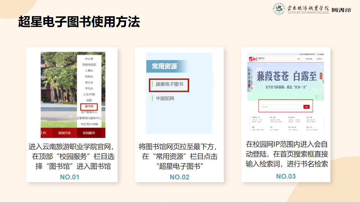 1. 登录图书馆官网→ 2.选择需要的数据库 → 3. 海量电子书、数据库任你捞!