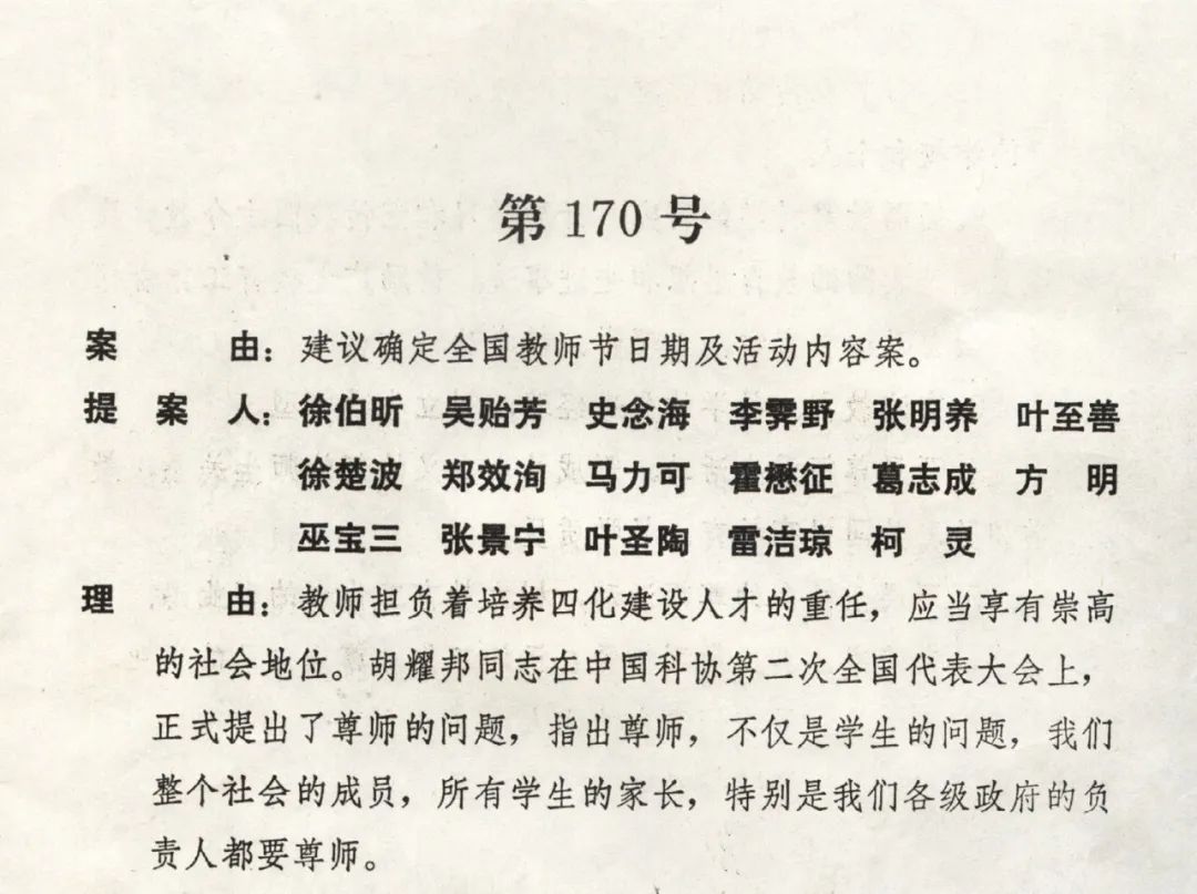 1981年,在全国政协五届四次会议上,民进17位政协委员联名提交了《建议确定全国教师节日期及活动内容案》。该提案被全国政协编为第170号。