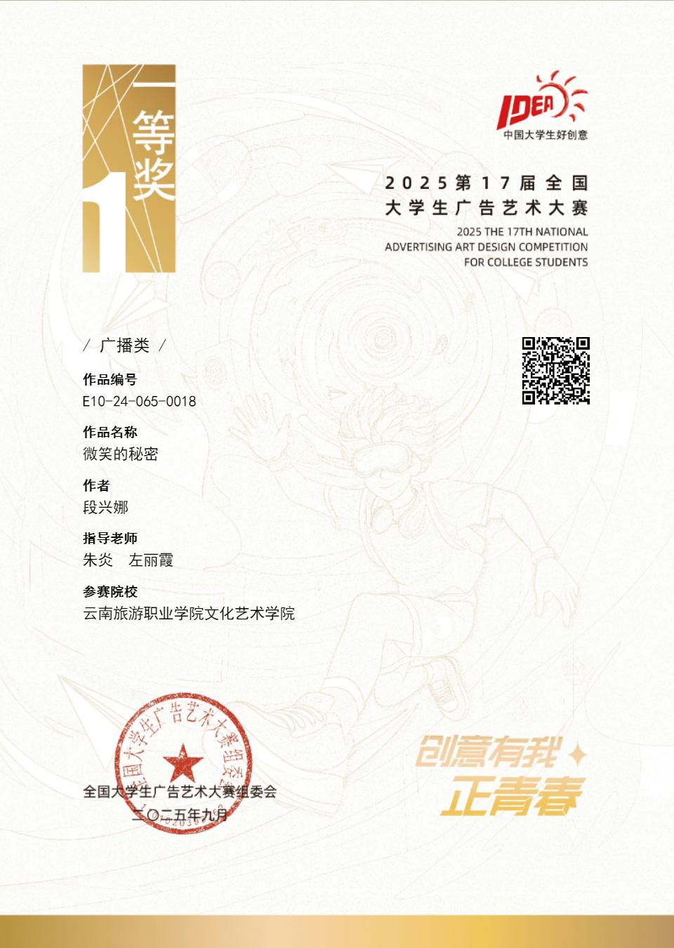 经过校级初评、省级遴选及全国总评审的多轮严苛考核,专业学子的作品凭借精准的受众洞察与创新的呈现形式屡获认可。其中,由 23 级学生段兴娜的作品“微笑的秘密”在全国总决赛广播类中斩获一等奖,另两件作品获评优秀奖,实现了国赛一等奖的突破性成绩;省级奖项方面,94 件获奖作品覆盖全部参赛赛项,获奖作品普遍呈现三大特色:一是紧扣品牌核心需求,深度解读命题策略单的传播目标;二是融合多元创作手法,将手绘插画、数字特效等技术与创意理念有机结合;三是关注社会现实议题,在商业传播中融入青春视角的价值表达。