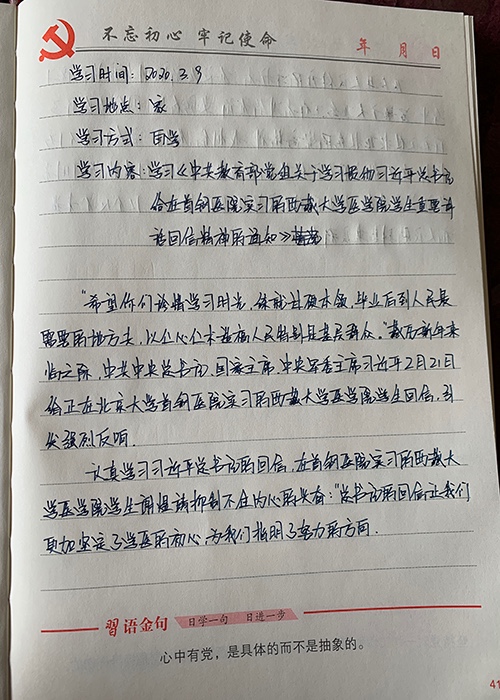 文化艺术学院教师党员以及学生党员以网络形式组织开展学习习近平总书记的回信,党员同志们通读、细读,反复温习近平总书记回信中的一字一句。作为教师党员及学生党员,要以参与新冠肺炎疫情斗争的广大医务工作者为榜样,引导学生练就过硬本领,厚植爱国情怀,努力为新时代造就更多高素质人才。