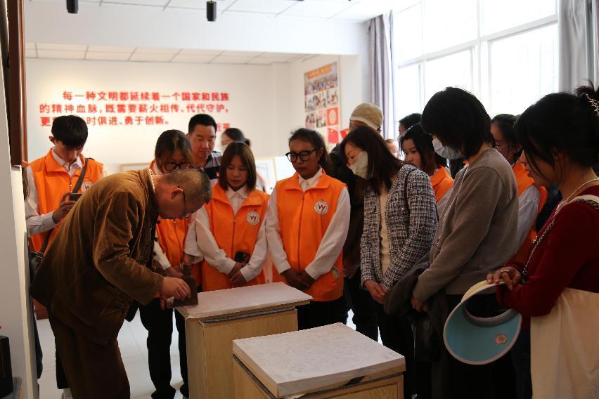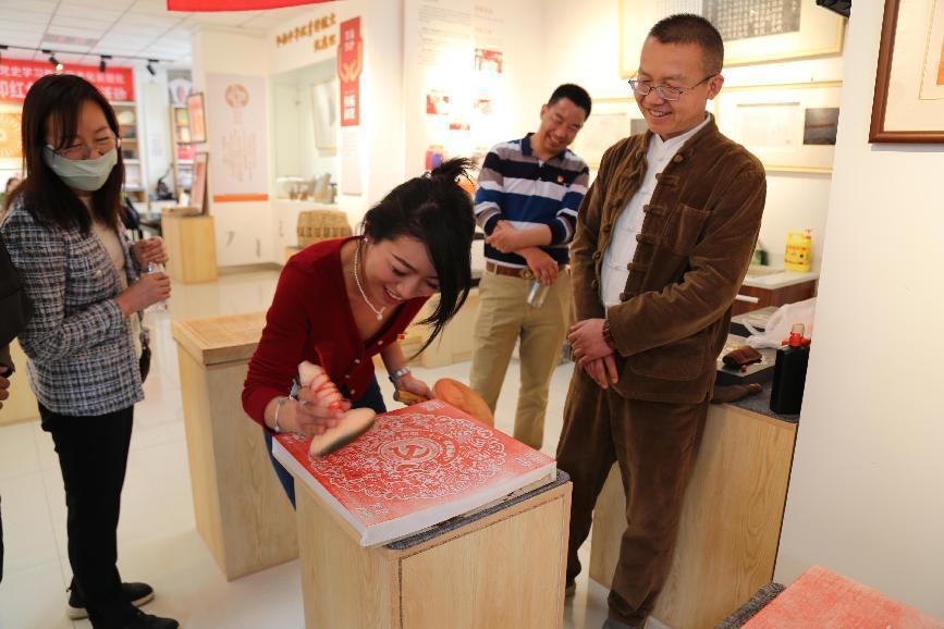 在传拓研习馆负责人、传拓大师张衡老师的带领下,全体教职员工参观了拓印的古籍、拓片,认识了拓印的来源、变化,欣赏了令人赞叹的拓印作品。在研习馆中,红色记忆系列的拓版尤其受到老师们的关注,张衡老师巧妙的将红色文化与传统技艺相融合,创造出富含当代特色的红色作品。在张衡老师的帮助下,老师们也上手体验了拓印这门技艺,收获了自己拓印的作品。