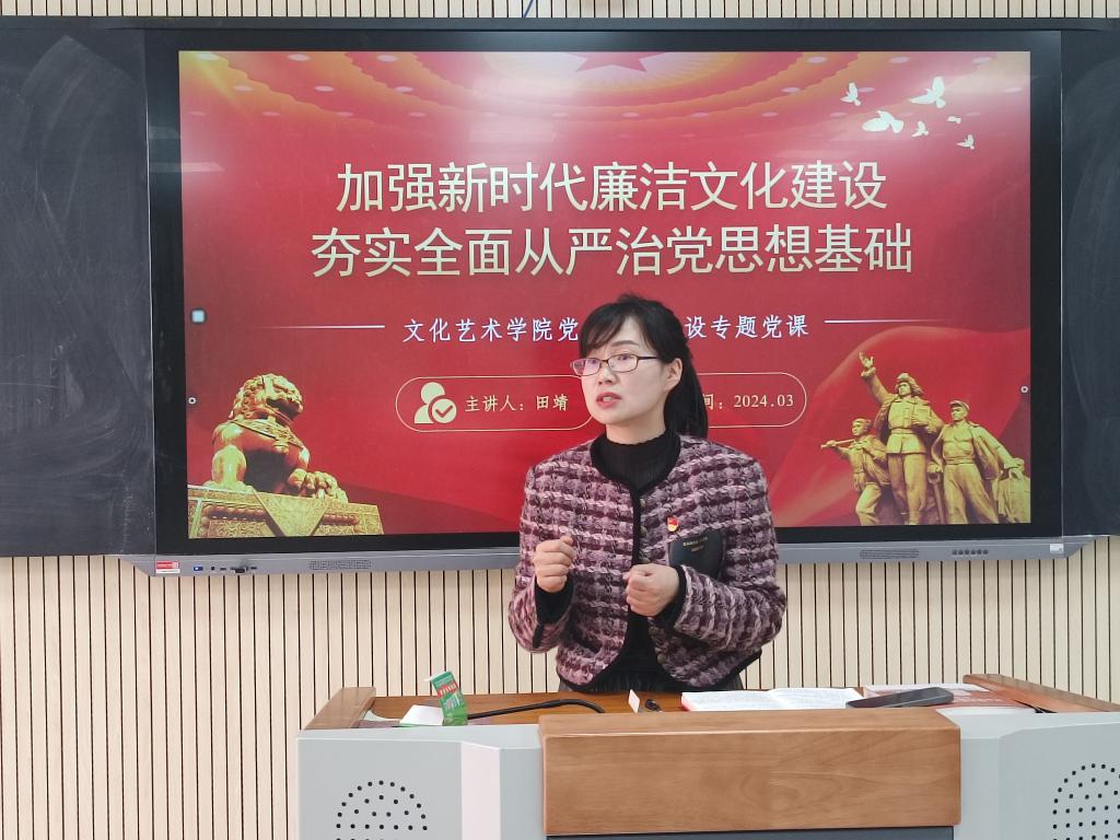 3月13日中午,党委委员、党委宣传部部长田靖为文化艺术学院党支部全体党员讲授“加强新时代廉洁文化建设 夯实全面从严治党思想基础”专题党课。内容聚焦于全面从严治党、新时代廉洁文化建设和三风建设等重要议题。此次党课旨在联系党的最新理论,提高党员政治站位和思想认识,进一步加强党的领导,推动学院高质量发展,为云南教育事业高质量发展谱写bevictor伟德国际1946官网新篇章。