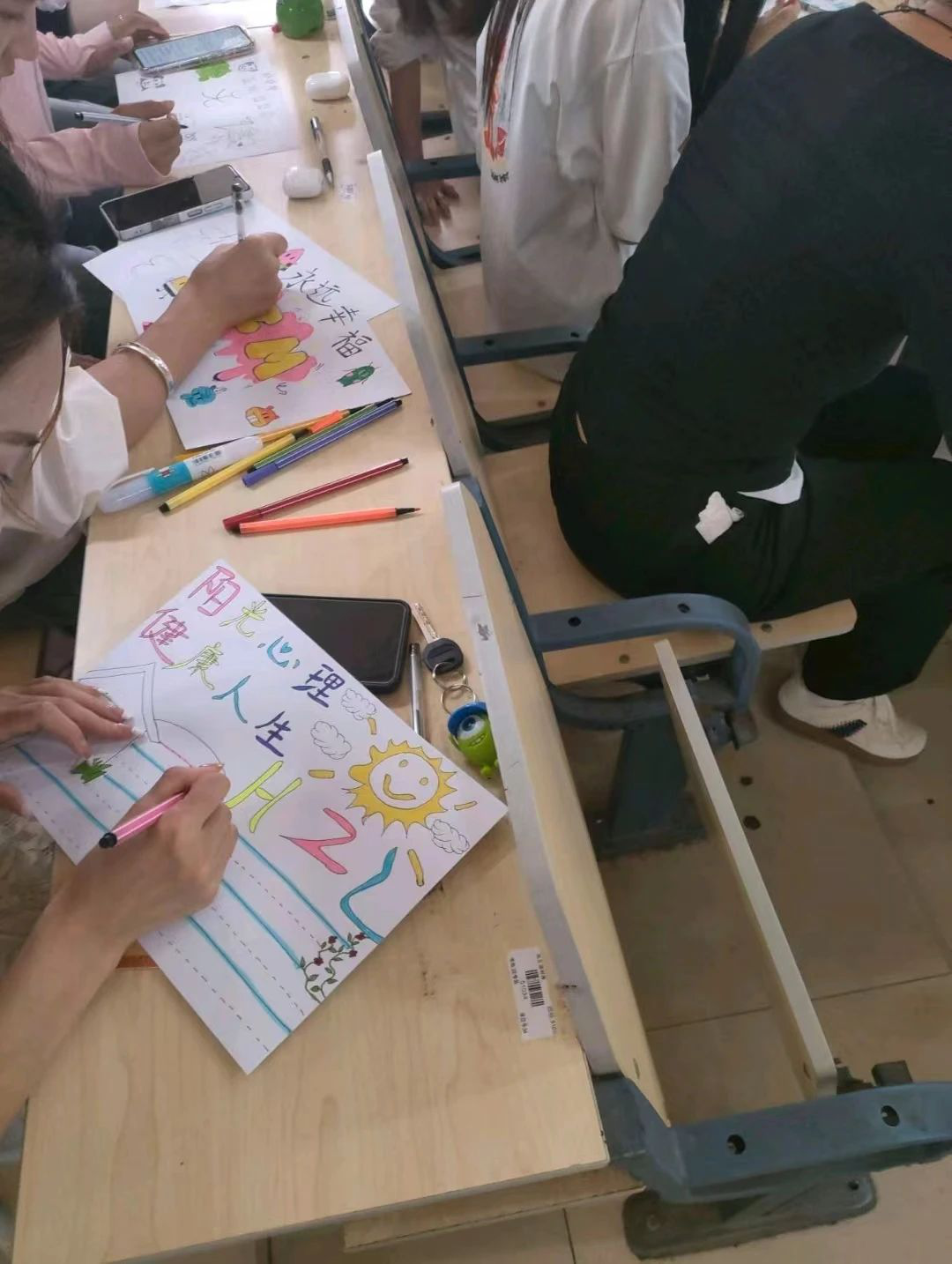 活动过程中,工作人员为同学们各分发了卡纸和笔,大家在纸上写下对自己赞美的话语,或是画下自己心中美好的图景,大家坐在一起分享彼此的绘画和心情,我们随机抽取了几名同学给我们分享了自己对于心理健康的看法和自己的绘画。在同学们进行绘画的时候现场播放了很多轻音乐,为的就是在这短暂的瞬间让同学们放松下来,学习调节情绪的办法,体验美好人生,关爱自己、爱他人、爱生活、爱社会,以积极健康的心理状态面对生活的挑战,迎接美好未来。