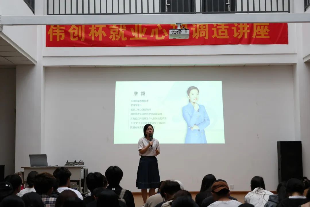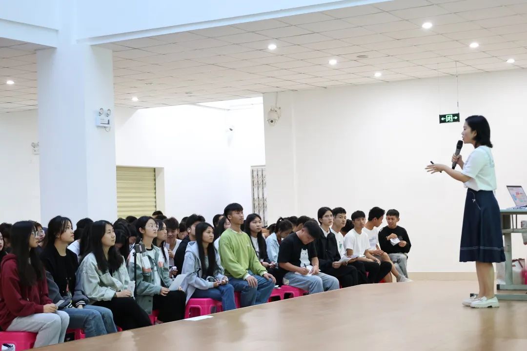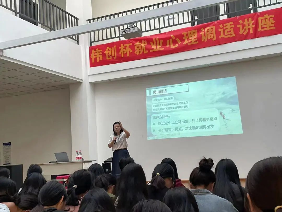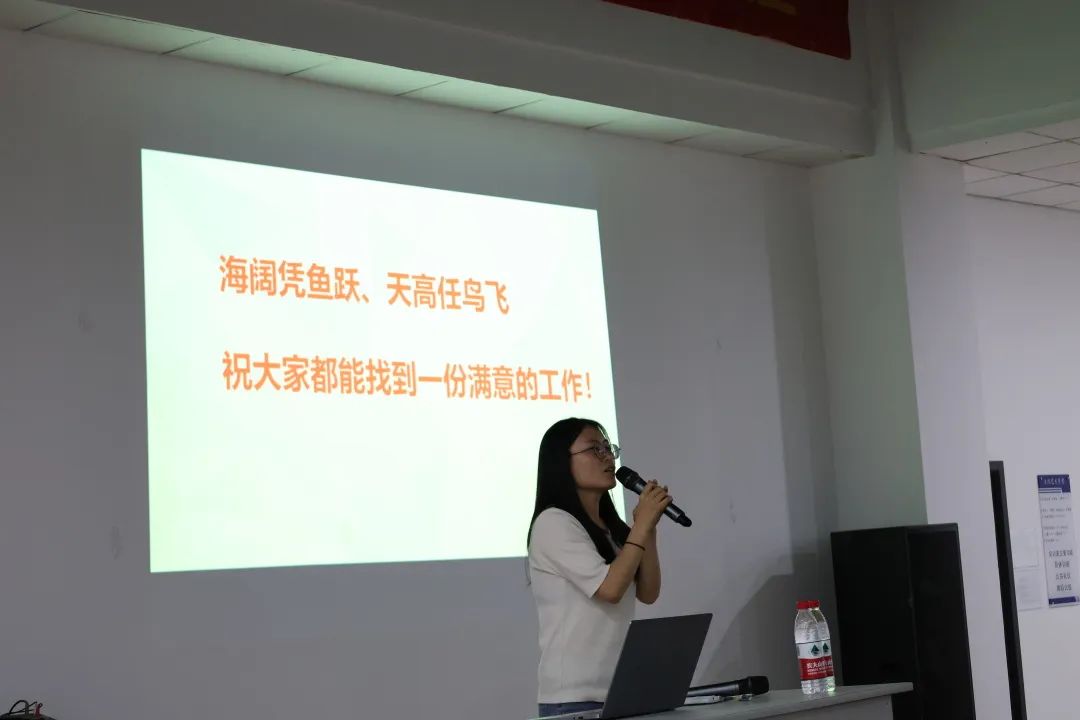 活动中,廖颜老师以两个游戏开始,分别是沟通小游戏和爬山算法。两个游戏过后,现场的氛围变得十分和谐、融洽。廖颜老师从学生就业前的焦虑、自卑、学历提升等内容分别展开,耐心为同学生答疑解惑,引导同学们从职业兴趣,再逐步过渡到职场人士的工作状态,帮助同学们梳理和整理自身优缺点,正确面对职场。