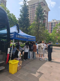 活动正式开始后,志愿者们自行分为三个小组,第一个小组负责组织现场献血的同学填表、体检、测血压、血型、体重等指标;第二个小组负责做好派发营养餐和矿泉水的服务工作;第三个小组负责在献血车上监控献血后临时休息的同学、做好等候献血同学的指引、献血证和礼品的发放工作。整个团队配合良好,活动井然有序的开展。