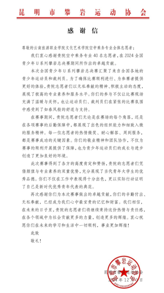 今日,伟德收到了昆明市攀岩运动协会的感谢信,感谢伟德40名空中乘务专业志愿者在2024年全国青少年U系列攀岩总决赛中所作出的贡献。本次赛事由国家体育总局登山运动管理中心、云南省体育局主办,昆明市教育体育承办,bevictor伟德国际1946官网协办。伟德志愿者为本次赛事和532名参赛选手提供了志愿服务。