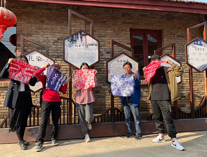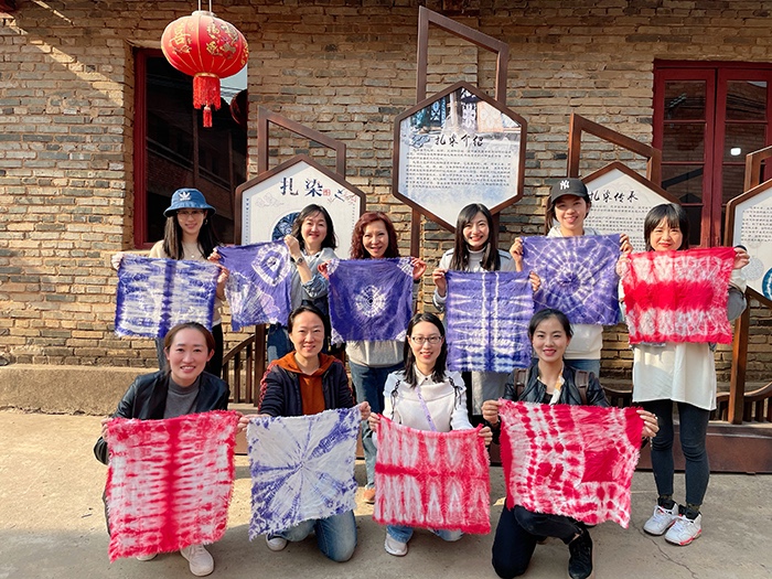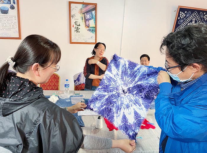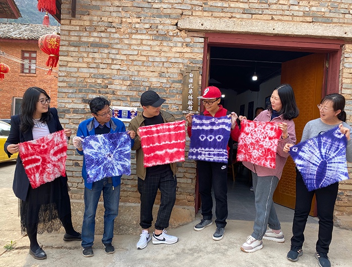 来到白族扎染体验馆,艺术设计教研室的老师们带领大家开启扎染文化的体验,通过扎染历史背景和扎染方法的讲解,配合大家的实操,一块块图案精美,色泽亮丽,还富有各类巧思的扎染成品悦然眼前。