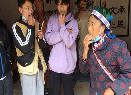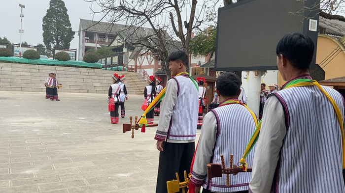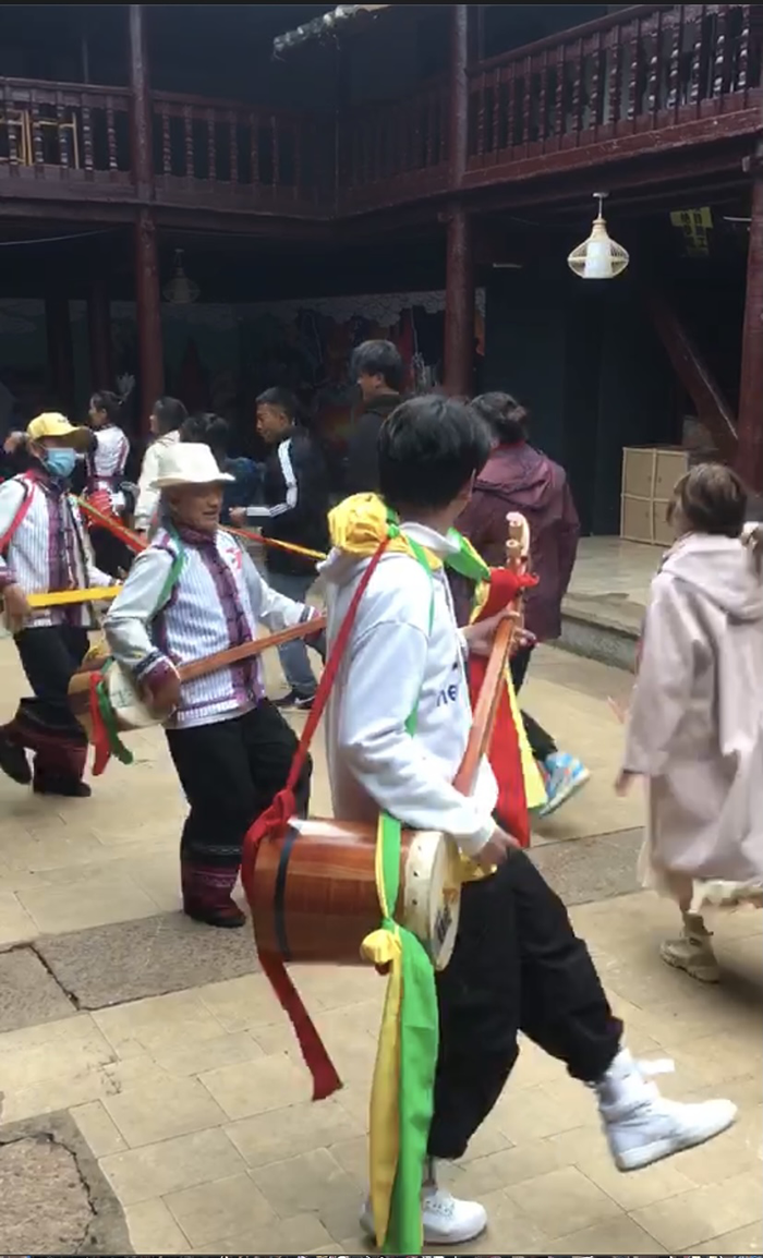 16日上午同学们到达弥勒的可邑小镇。可⾢⼩镇已有360年的历史,彝族传统⺠居、⺠族⽂化和古朴的⺠⻛⺠俗,同学们在陈列室观看反映阿细⺠族故事的微电影;在阿细跳⽉⼴场体验观看节奏明快、热情奔放的《阿细跳⽉》⼤型歌舞表演;在⾮遗传承四合院领略浓缩着阿细⽂化精华的《阿细的先基》演出,同学们还跟民间艺人学习了大三弦和叶片的演奏,并且在现场学习了阿细跳月的步伐和舞姿,感受古朴的阿细⺠族⽂化。