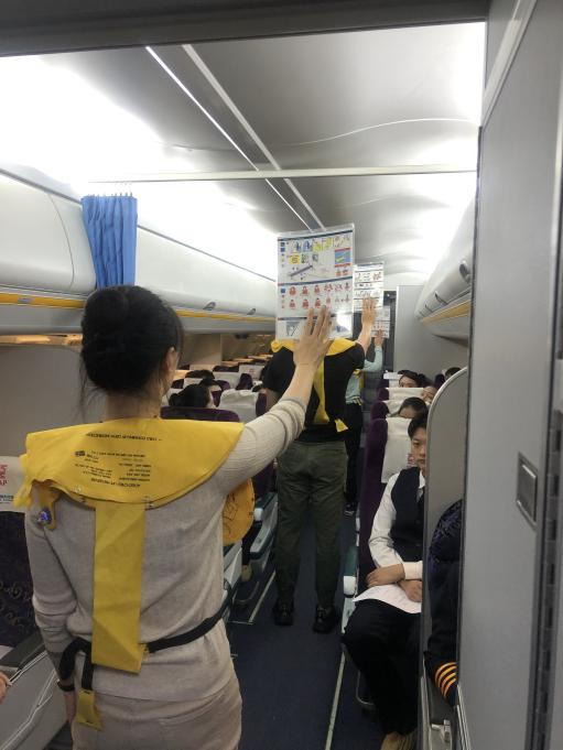 4名乘务员进行救生衣安全出口的