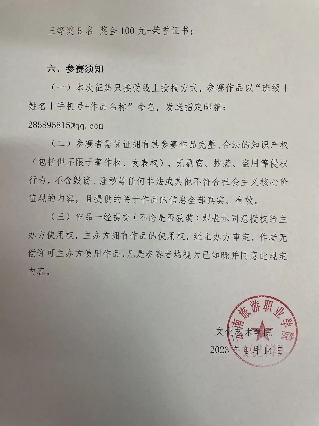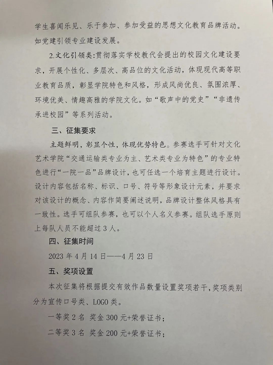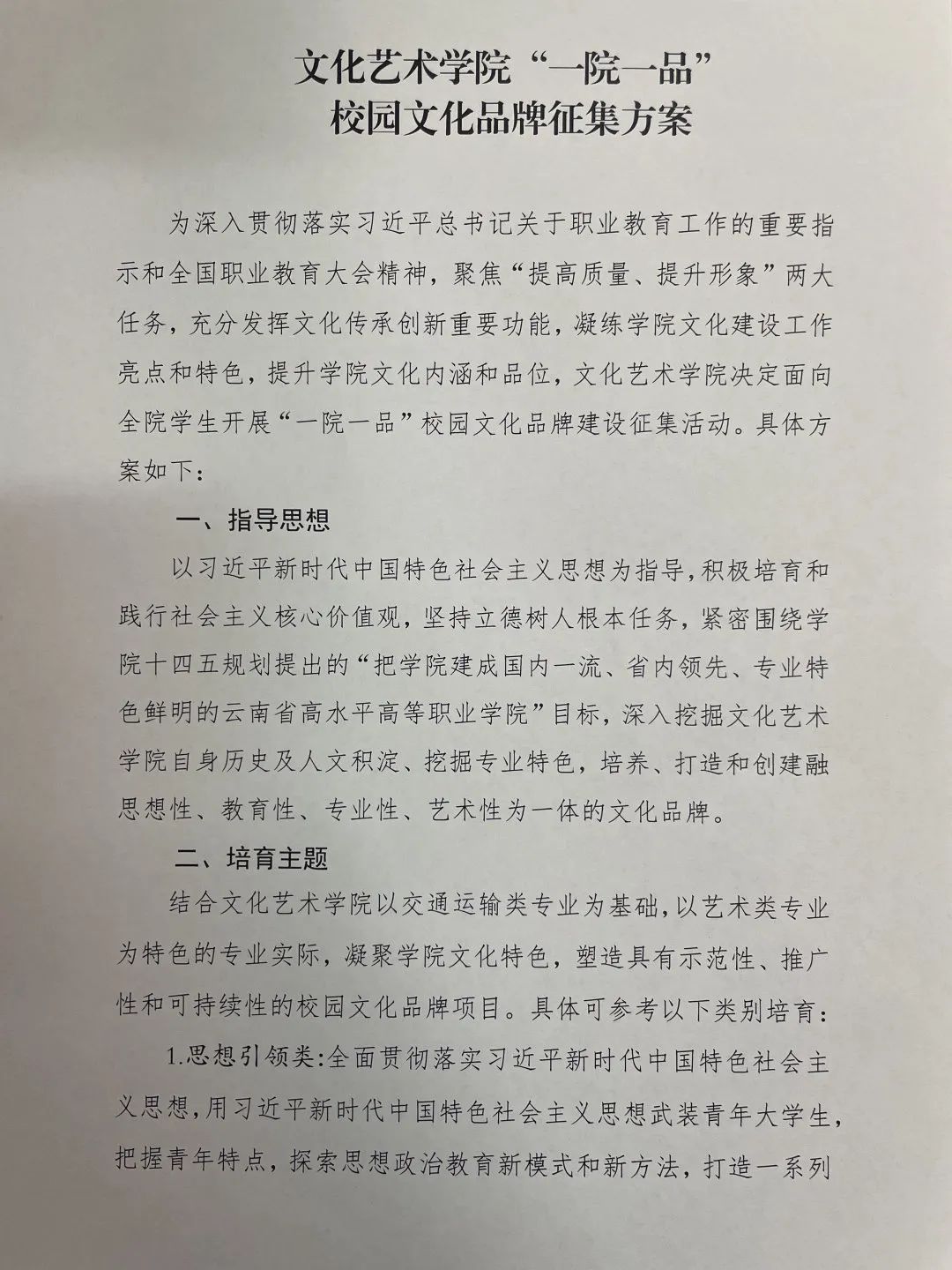 为深入贯彻落实习近平总书记关于职业教育工作的重要指示和全国职业教育大会精神,聚焦“提高质量、提升形象”两大任务,充分发挥文化传承创新重要功能,凝练学院文化建设工作亮点和特色,提升学院文化内涵和品位,4月14日-4月23日,文化艺术学院面向全院学生开展“一院一品”校园文化品牌建设征集大赛活动。