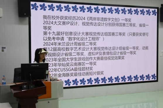 广告2202班李莹玉现场揭秘职业竞争力构建密码。这位昆明格道企业营销策划有限公司设计助理,以《两岸非遗数字文创》国赛一等奖等十余项赛事荣誉为注脚,系统阐释 "兴趣深耕+实习实战"的能力锻造路径。其展示的2024米兰设计周省级二等奖作品、高校数字艺术设计大赛三连冠成绩单,为在场学子树立清晰的能力提升标杆。