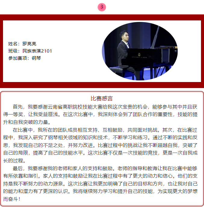 近日,云南省教育厅公布了2023年云南省职业院校技能大赛获奖公示名单。伟德由黄硕、彭菊珍老师带队,李艳梅、白金阳、罗亮亮三位同学组队参赛的“声乐、器乐”赛项荣获了省级一等奖。荣誉获得的背后,离不开精心准备和辛勤付出。