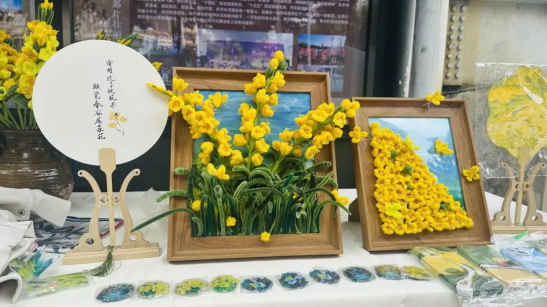 罗平油菜花海是云南春季标志性景观,其金黄花田、喀斯特峰林及布依族文化元素蕴含丰富设计资源。广告艺术设计专业和工艺美术品设计专业依托地域特色,以职教周为平台,组织198名学生参与项目式教学,历经实地采风、方案设计、工艺打样等环节,将自然景观与民族文化转化为创意设计。展览现场,冰箱贴、手机壳等实用文创以简约线条勾勒花海轮廓;扭扭棒立体画通过多色拼贴呈现花海层次感;国风漆扇融合螺钿镶嵌工艺,以油菜花为主题展现传统漆艺的现代美学,吸引全校师生驻足参观。