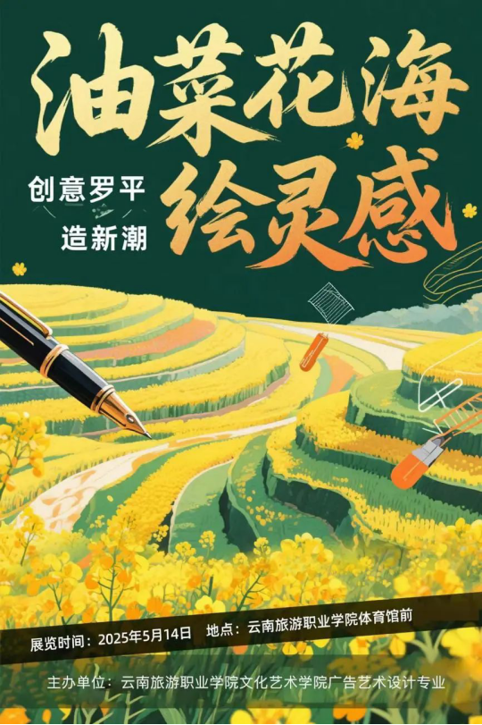 5月14日,伟德艺术设计教研室在学校体育馆前举办“油菜花海绘灵感,创意罗平造新潮”主题创意作品展览,20余件以罗平油菜花海为灵感的文创作品集中亮相,展现职业教育“设计服务生活、艺术赋能乡村”的实践成果。