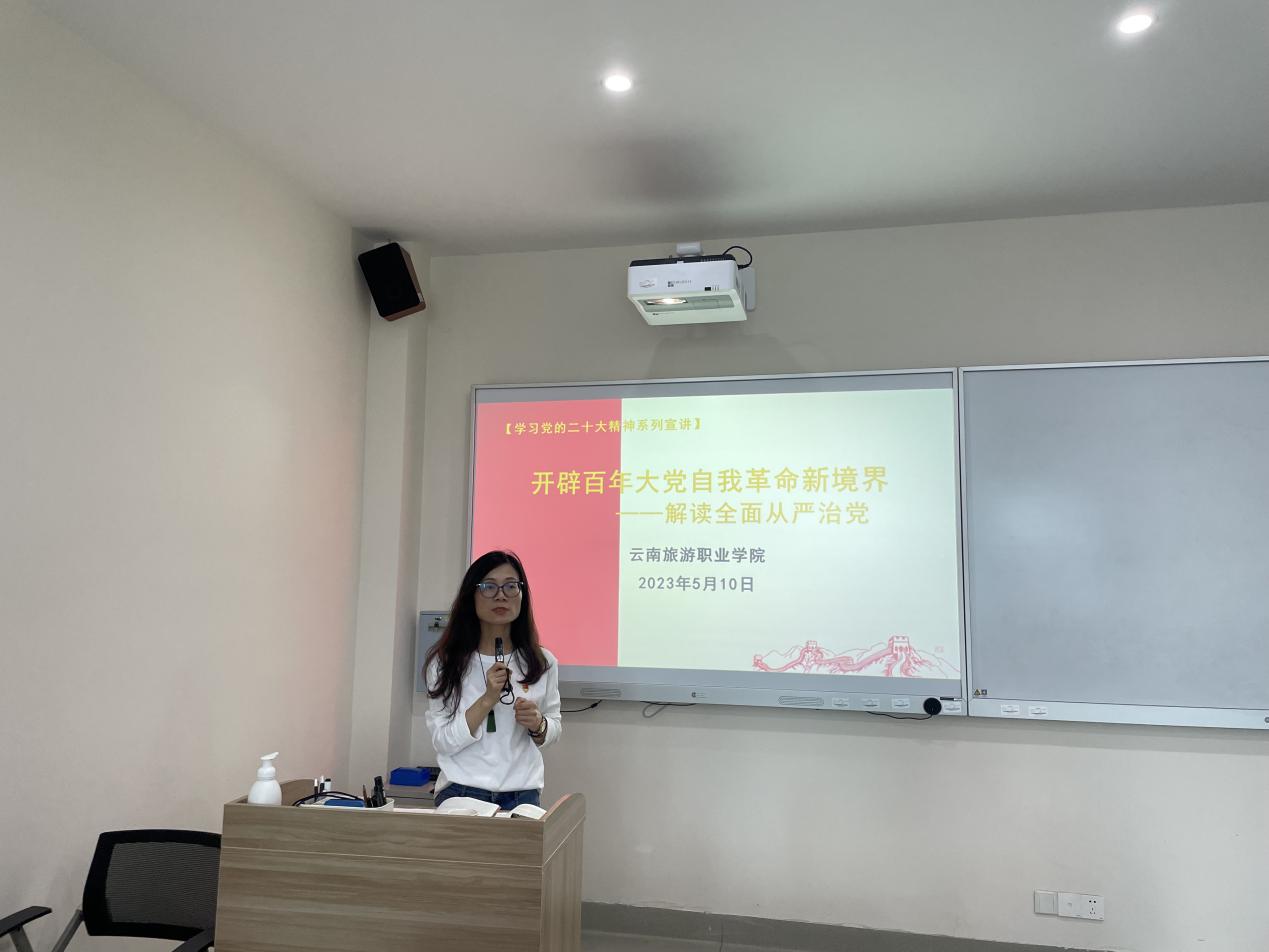 为深入学习贯彻党的二十大精神,2023年5月10日,学院党委委员、副院长王霞同志为外语学院党支部、烹饪学院党支部党员讲授了题为《开辟百年大党自我革命新境界——解读全面从严治党》的专题党课。外语学院党支部、烹饪学院党支部全体党员参加了本次党课学习。