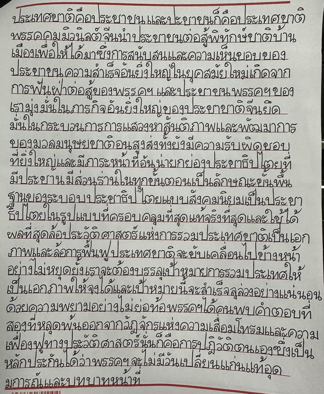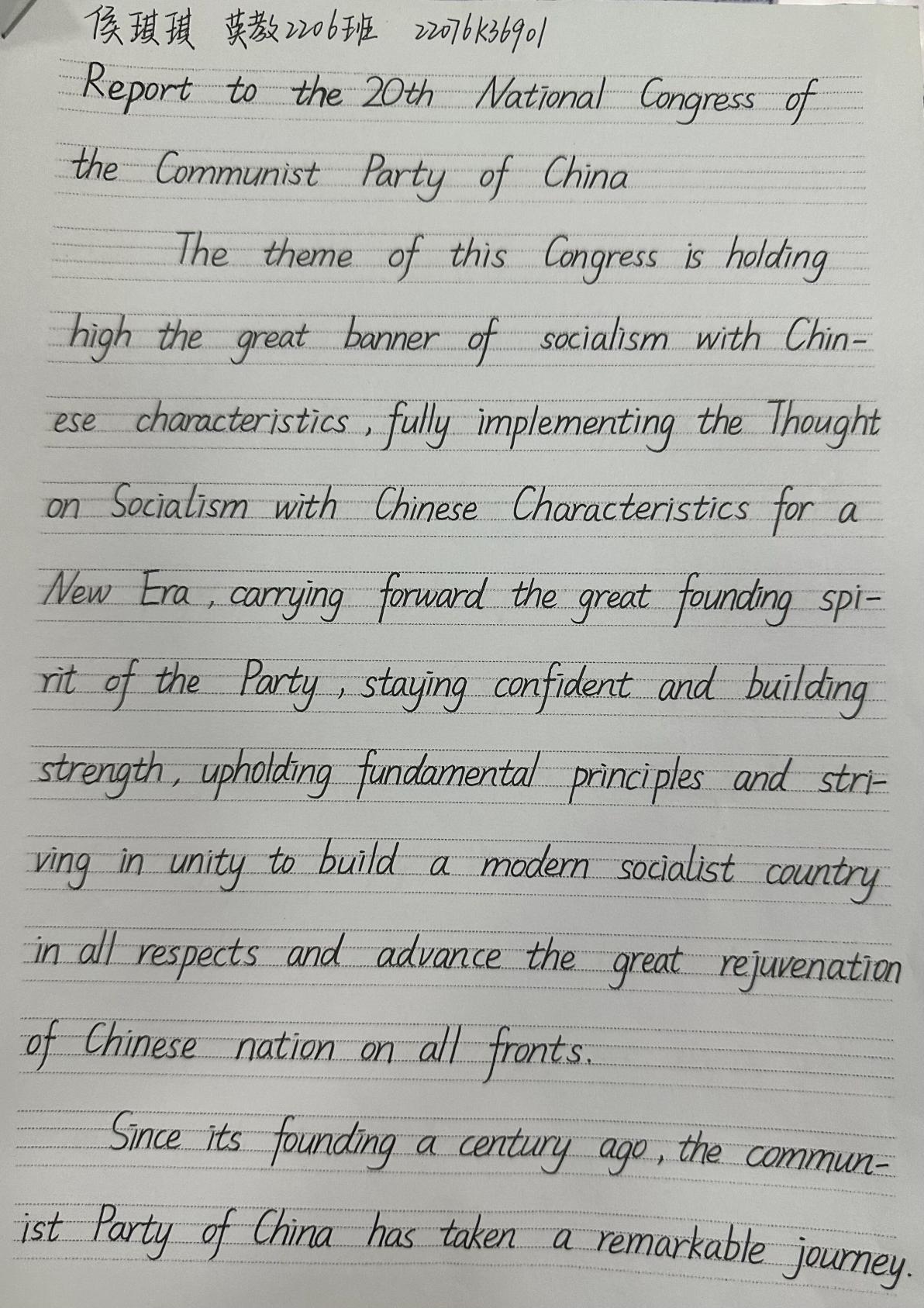 为弘扬党的二十大精神,厚植广大青年学生爱党、爱国、爱社会主义的情感,汲取伟大精神力量,踔厉奋发、砥砺前行,用笔尖书写对百年党史的感想,抒发对党的敬佩与感激,表达“永远跟党走,奋进新征程”的决心。外语学院举办“外语墨书二十大 践行誓言献青春”双语书法大赛,2022级小学英语教育、旅游英语、应用泰语专业的同学结合自身专业知识,以“党的二十大”报告以及相关文件为内容,用汉语、英语、泰语进行硬笔书法写作。