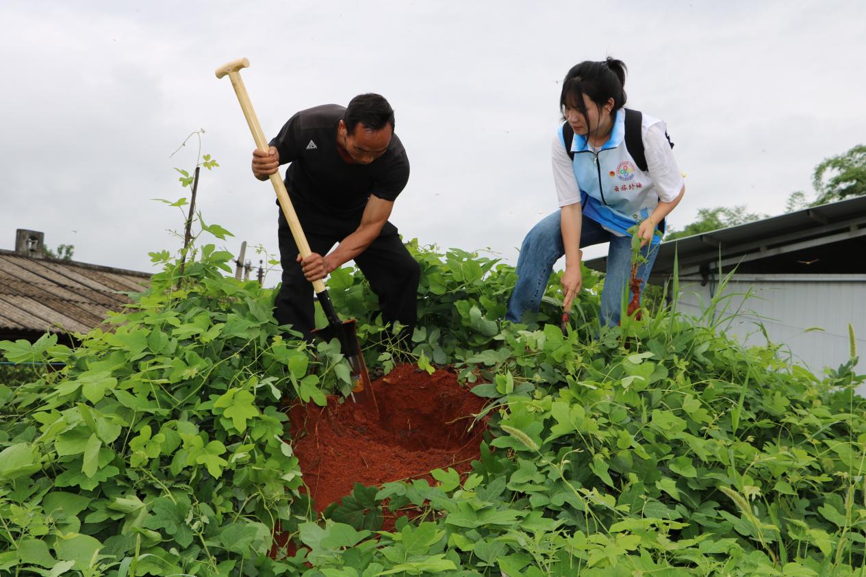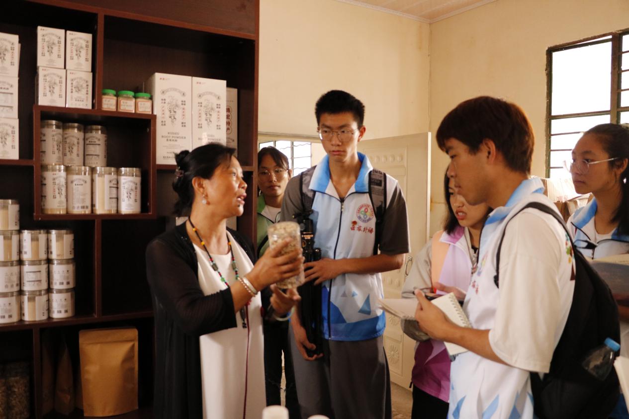 在德宏葛鑫农业发展有限公司,公司创始人赖金美女士对外语学院暑期社会实践团队的到来表示热烈欢迎并带领团队参观了葛根粉的厂房,厂房采用了先进的生产设备和技术对葛根进行初加工,确保每一个环节都能做到精细、精准,从而生产出高品质的葛根产品。团队成员还和工人们一起挖葛根、品尝了冲泡的葛根粉。随后,赖女士向大家讲述了她与葛根的不解之缘。2007年,一场意外车祸导致她全身瘫痪,生活陷入困境。她发现家门口的葛根成为了她康复过程中的重要帮手,这让她萌生了种植葛根的想法。公司充满传奇色彩的创办、发展历程让同学们深受启迪和教育,之后同学们向赖女士提出相关调研问题,整个氛围其乐融融。赖女士艰苦奋斗、不忘初心的创业精神,积极响应国家乡村振兴战略创办企业,由此带动了周边村落葛根产业的发展,都让同学们对乡村振兴有了进一步的认识。