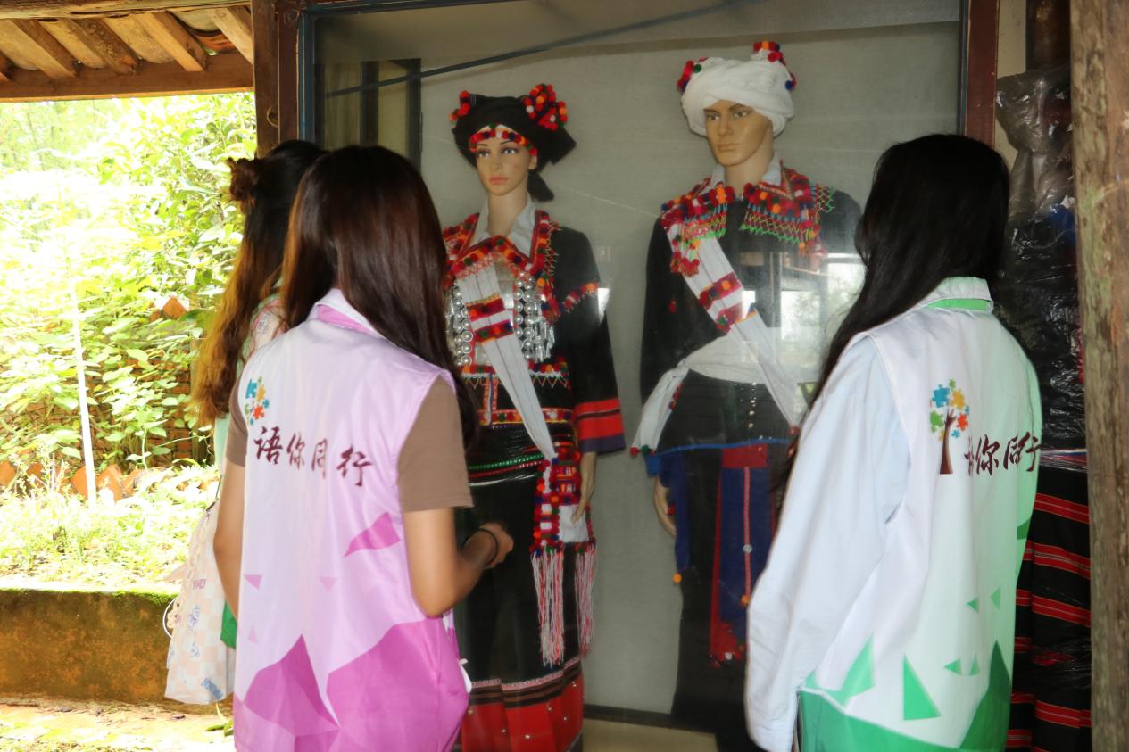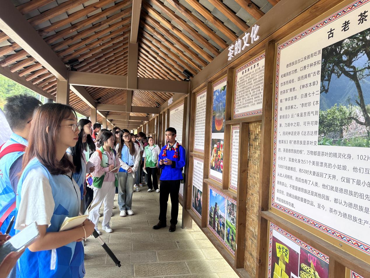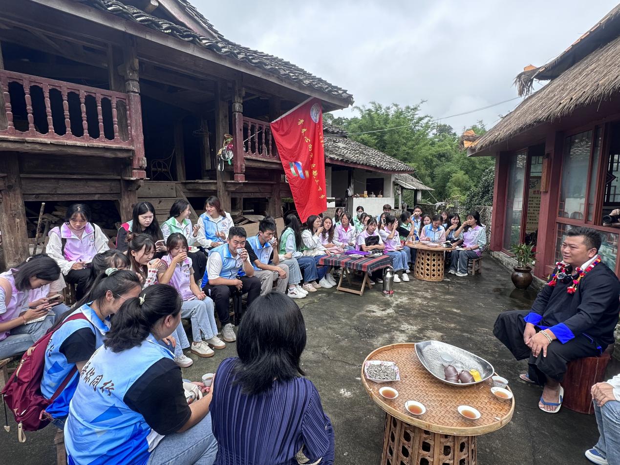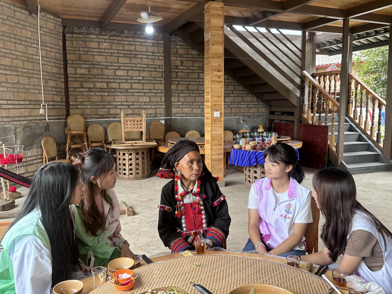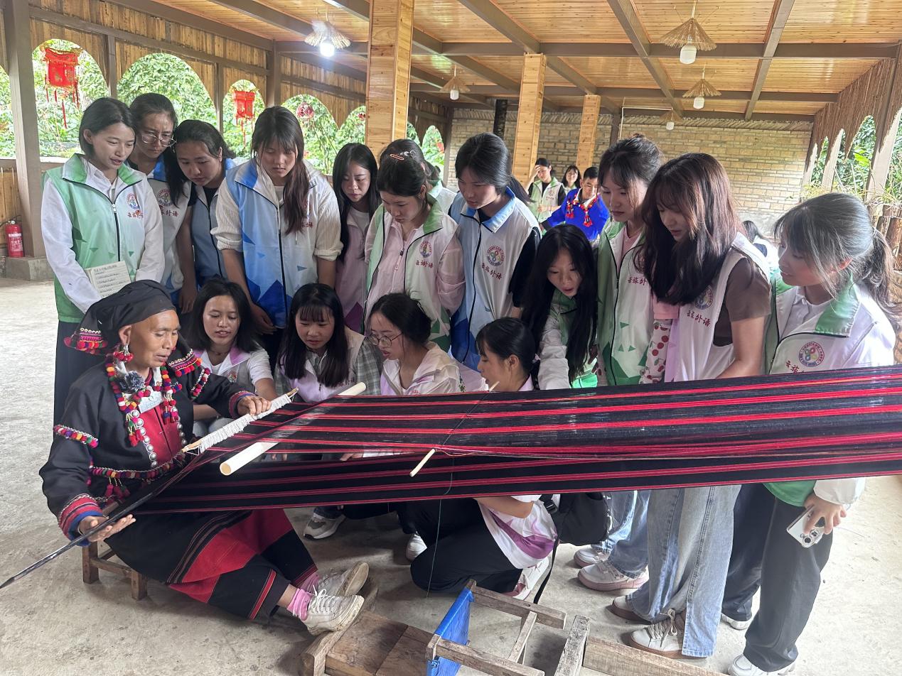 7月14日上午,团队到达三台山出冬瓜村德昂族乡参观学习,在文化长廊,讲解员绘声绘色地为大家介绍了德昂族的基本情况、历史文化、民俗风情,特色产业等。随后同学们来到国家级非物质文化遗产酸茶传承世家。酸茶制作人向大家详细述说酸茶的由来、制作过程及益处等,同学们品尝着酸茶,淡淡的清香席卷了味蕾,虽略有酸涩,但甘甜生津。来到农家小院,团队体验了当地的传统体育项目,打蜡盒、陀螺和水鼓等活动使现场充满欢声笑语。随后团队欣赏到了精美的德昂族服饰。德昂族古老的织锦工艺,纯手工操作,耗时长,体现了“慢工出细活”的特点,充分展示了德昂人高超的技艺和耐心,是德昂女子持家的灵魂所在。在观看了心灵手巧的老奶奶现场织锦过程后,同学们迫不及待地和老奶奶进行了交流。老奶奶希望同学们多做宣传,她真诚地盼望能将德昂族这项传统技艺推介出去,让更多的人了解、关注,大家共同参与到保护与传承德昂族这一古老的民族民间传统文化中来。