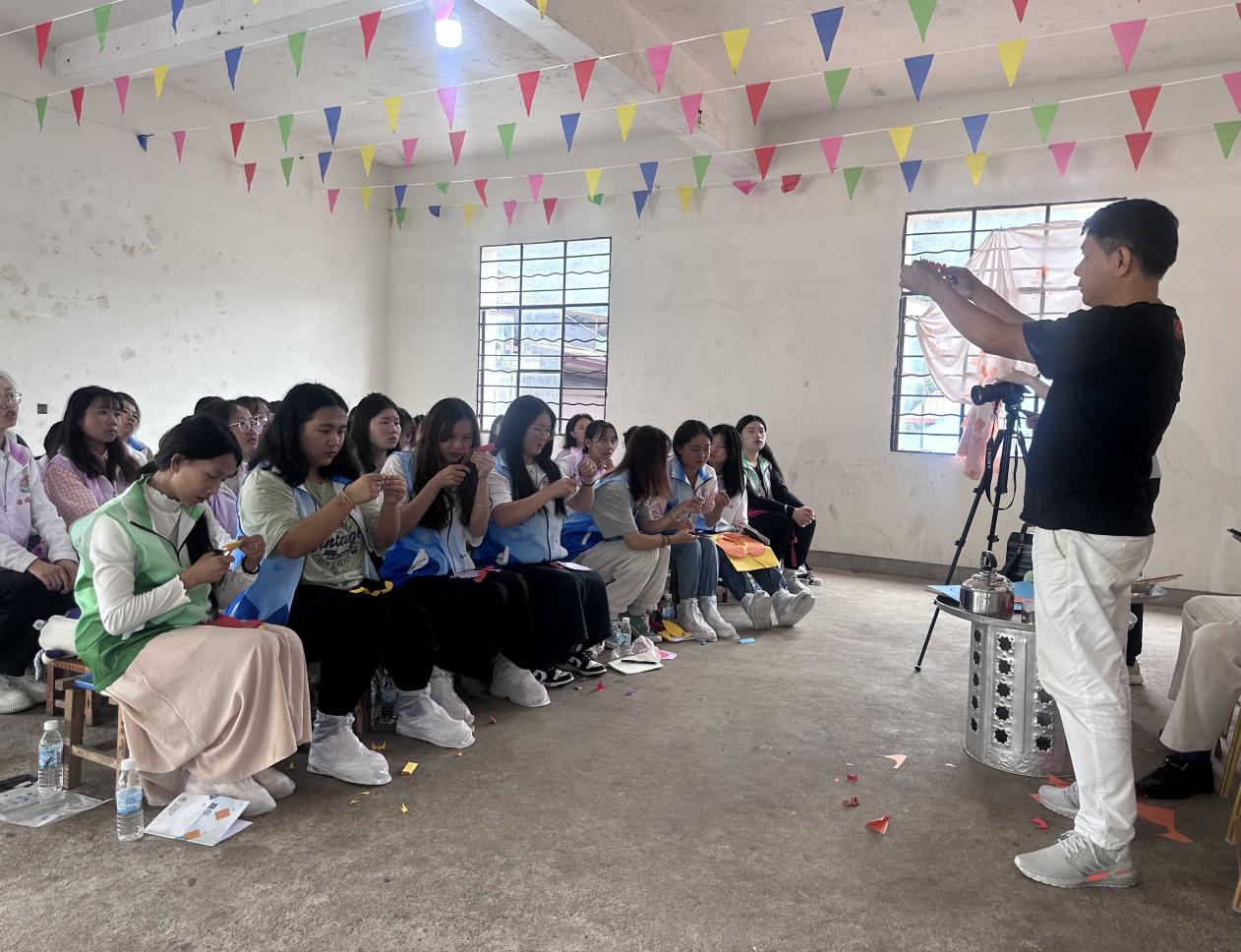 7月11日下午,团队来到了勐目村。全体师生有幸聆听了德宏著名的三位文化名家的讲座。卫明礼和卫明儒老师分别向大家介绍了孔雀舞的渊源、傣族音乐的鉴赏。老师们时而慷慨激昂,时而舞步偏偏,同学们都听的津津有味。非物质文化遗产傣族剪纸代表性传承人樊涌老师跟同学们分享了傣族剪纸的特点和传承,现场授课使同学们近距离感受剪纸的神奇美丽,一副副栩栩如生的作品令同学们赞叹不已。傍晚时分,同学们还与当地村民一起载歌载舞。淳朴好客的村民跳起了傣族特有的民族舞蹈,青春洋溢的同学们也表演了活力四射的现代流行歌舞。一天的活动在歌声中结束,同学们深度体验到当地的民族特色文化,还深刻感受到文化传承大师们对非遗文化的热爱和坚守,并意识到,非遗文化的传承与传播,离不开青年一代的守正创新。
