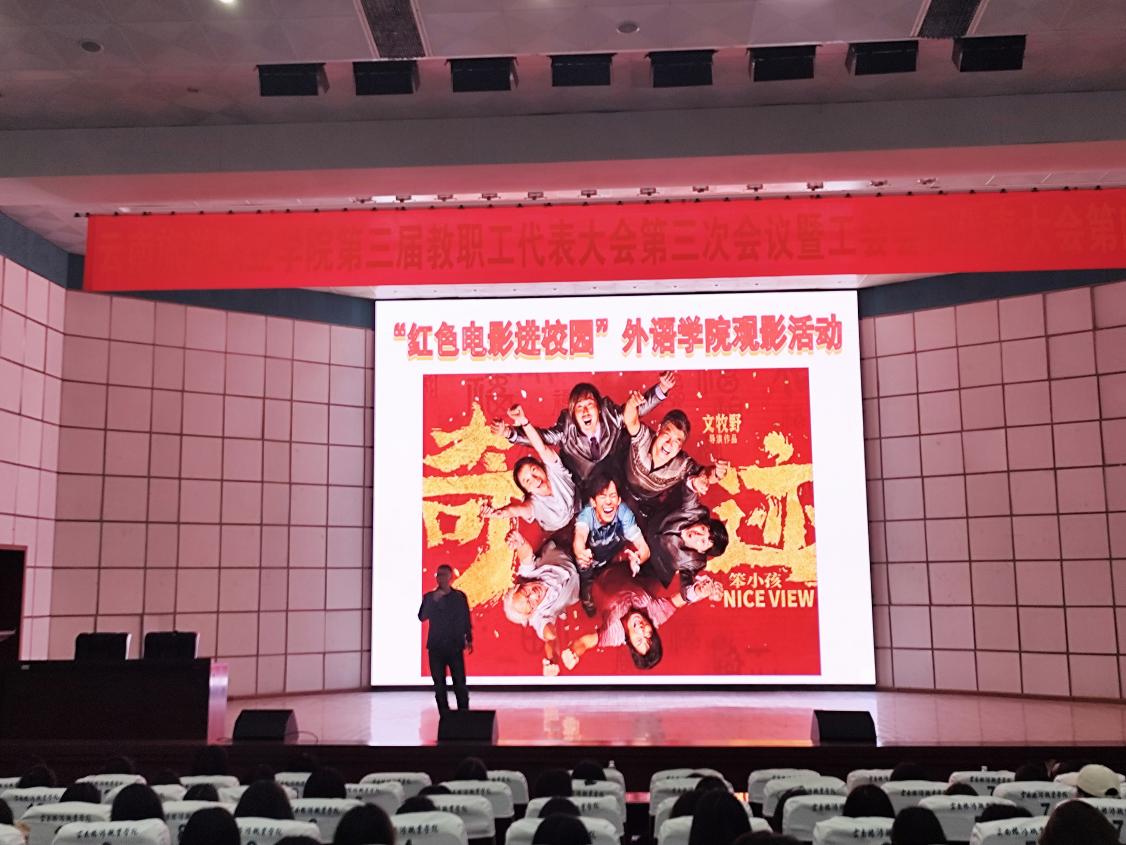 近日,外语学院组织开展“传承红色基因,电影照亮校园”主题观影活动。全体教职工、各班级学生共计500余人在校本部报告厅集中观看励志电影《奇迹·笨小孩》。