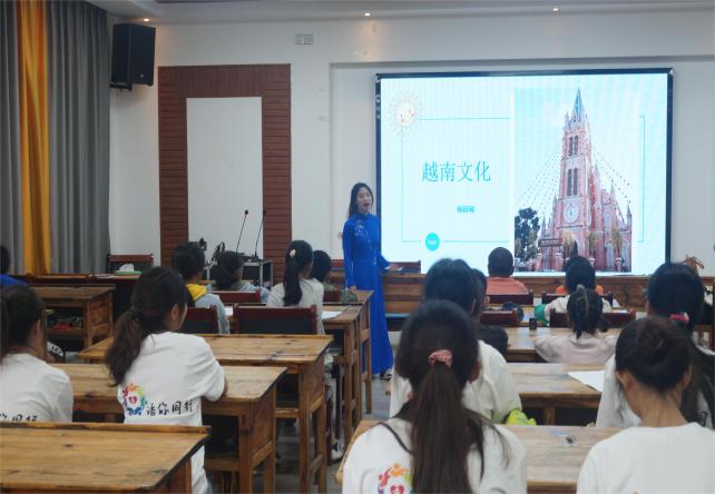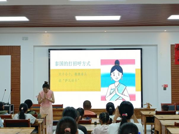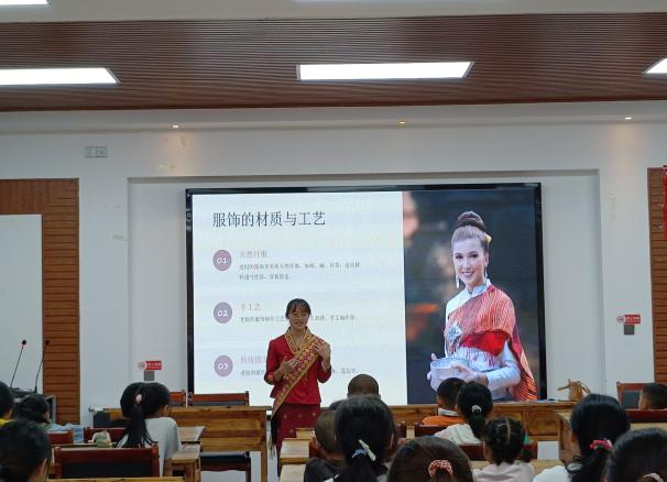 随后,实践团队员们身着精美的泰国、越南、老挝和韩国服装分别进行各国文化展示,通过介绍各国地理位置、服饰、美食等让学生们仿佛体验了一次异域之旅,拓展了学生的国际视野,坚定学生的文化自信,也让学生们对“一带一路”倡议的内涵有了更深的认识,并在心底埋下了一颗去看世界的种子。