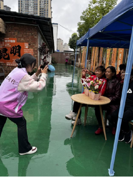 活动当天,细雨蒙蒙,外语学院的20名学生身着“语你同行”志愿者服装,早早地来到了活动现场。在邻里小院,社区为老人们准备了各式各样的鲜花和插花工具,在工作人员的指导下,老人们兴趣高涨,一支支五颜六色的花很快就被制作成了属于他们自己独一无二的花束。志愿者们耐心地引导老人们摆出各种姿势,用镜头捕捉下了老人们在美丽花束映衬下幸福的笑容和温馨的瞬间。
