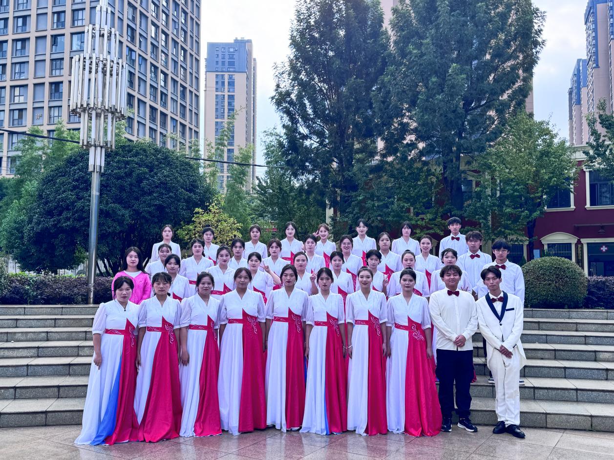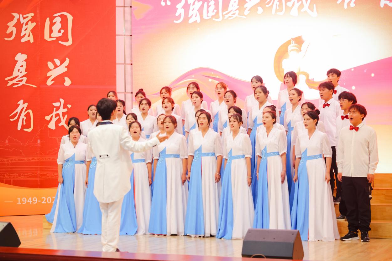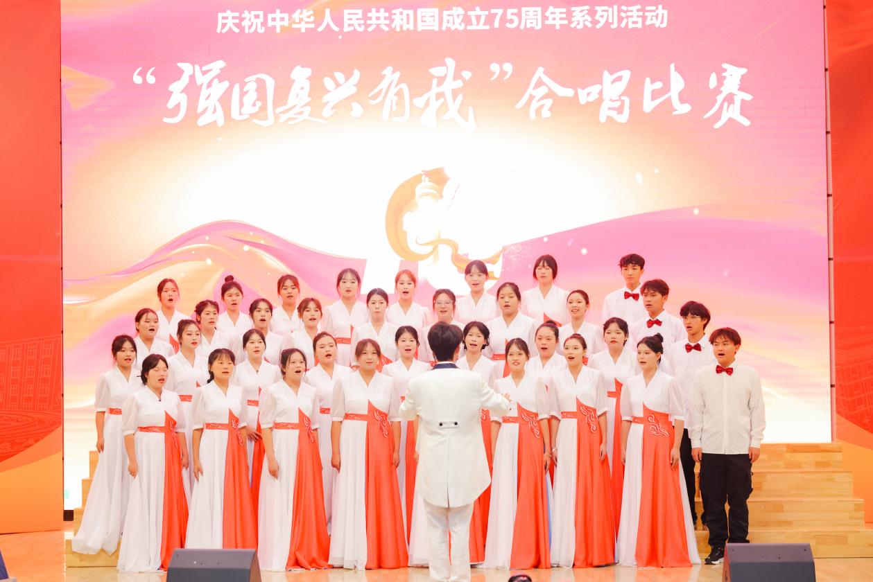 活动当天,学院报告厅内座无虚席,来自全校8个二级学院的合唱队伍齐聚一堂,共同用歌声祝福祖国、祝福母校。外语学院合唱队由外语学院各专业共36名同学组成,在游慨成同学的指挥下,他们带着激情和力量,深情演绎了自选歌曲《我爱你中国》,将对伟大祖国的无限热爱和对民族复兴的坚定信念传递给了每一位听众。必唱曲目校歌《给明天一个美丽的期待》不仅传承了学校的文化精神,也凝聚了奋进向上的力量。他们用激昂而有力的歌声表达了对母校的热爱和对未来的憧憬,展现了外语学子作为新时代青年的责任感和使命感。
