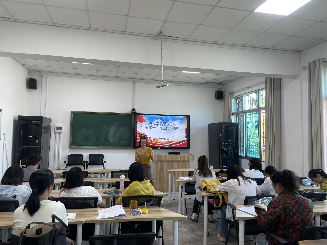 为认真学习宣传贯彻落实云南省工会第十三次代表大会精神,外语学院工会小组分别于9月15日下午组织全体党员在紫晶楼242党员活动室、9月20日下午组织全体教职工在综合楼313实训室召开会议,及时进行了传达学习。