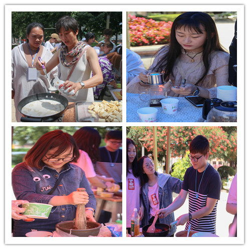 以美食为纽带,由“吃”出发,真正是“吃”出了文化,“吃”出了共鸣。在各组老师指导下,外语学院的同学们忙的不亦乐乎,一道道精美菜式相继惊艳亮相:营养美味的汉堡、香辣爽口的炒花甲、具有韩国特色的韭菜煎饼、年糕、日式章鱼小丸子……各类美食制作精美、飘香四溢,引得师生们垂涎,奔走于各个美食摊前一边品尝美食,一边品鉴文化。