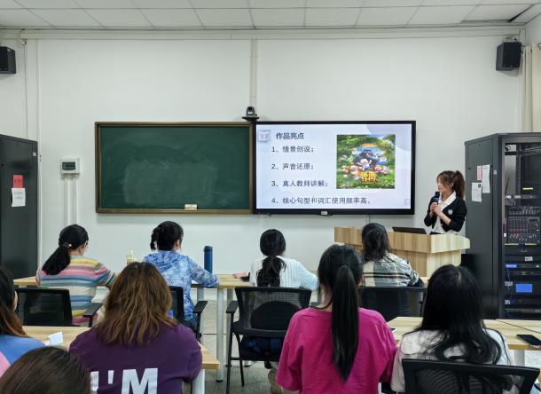 随后的正式比赛中,13支参赛团队依次亮相,以“作品介绍+作品展示”的形式展开激烈比拼,亮点频出:多支团队聚焦“AI+真人互动”,通过AI生成卡通角色语音,团队成员真人出镜、对话互动,构建了沉浸式学习场景;部分团队则创新设计“贪吃猫”“句子拼图”等英语互动游戏,更有的团队自主填词幼儿歌曲并亲自演唱,让词汇学习与音乐趣味融合……从动画特效、字幕设计到多模态资源整合、交互式课件应用,全面展现了学生们对现代教育技术的娴熟运用。现场气氛热烈,评委与观众不时为精巧的教学设计与亮眼的技术呈现鼓掌喝彩。