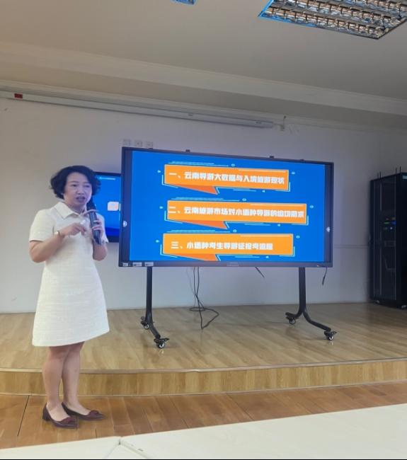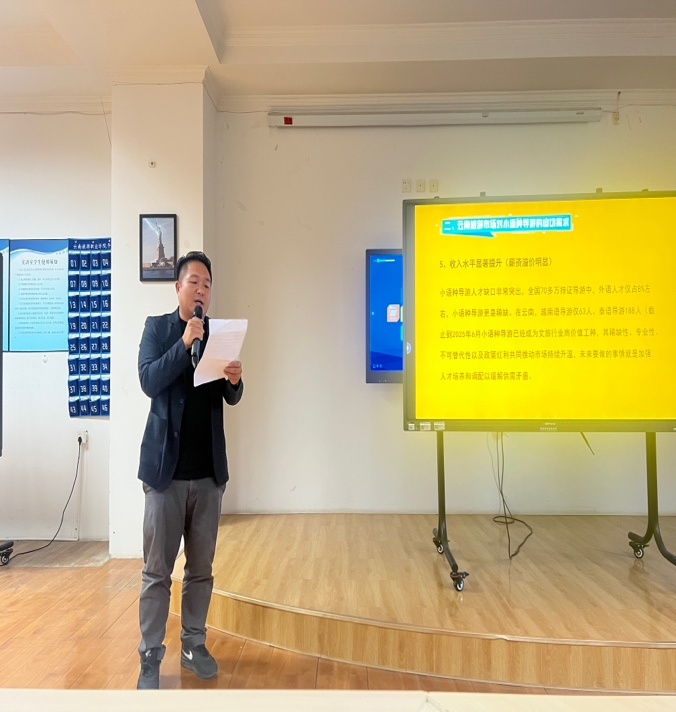 宣讲会邀请到云南省导游协会会长杨洁卿女士、云南招泰国际旅行社有限责任公司总经理翁座先生两位业内资深专家。杨会长以“云南省跨境旅游发展现状与小语种导游人才需求”为主题,深入分析了云南跨境旅游市场的蓬勃态势,明确指出小语种导游,尤其是泰语导游,目前面临巨大人才缺口,职业前景极为广阔。她还详细介绍了考证公益辅导项目,为学生备考提供了有力支持与专业指导。