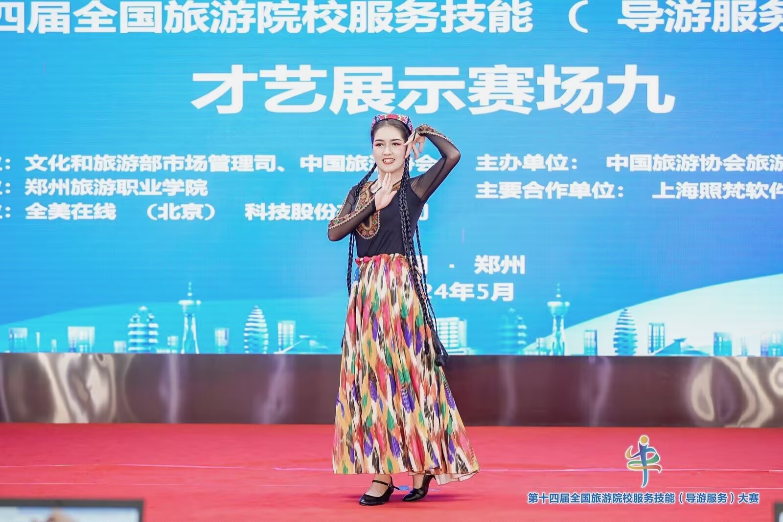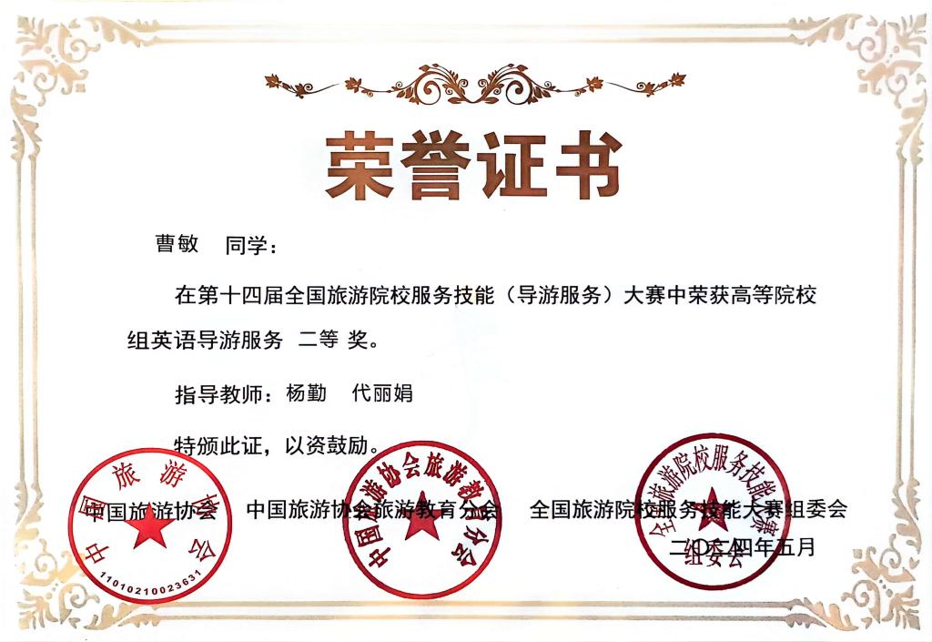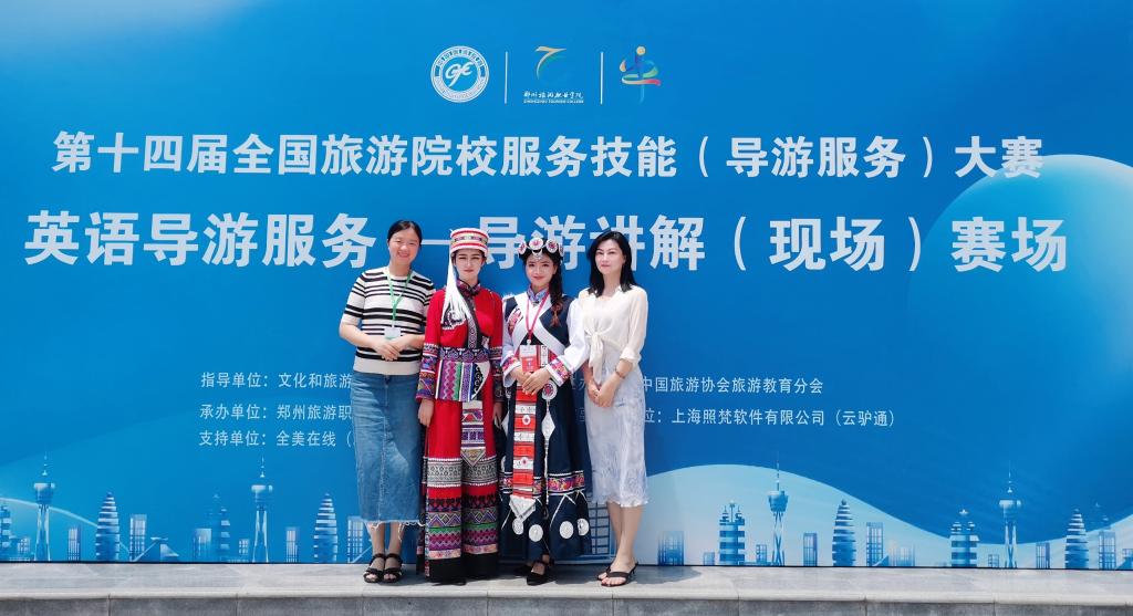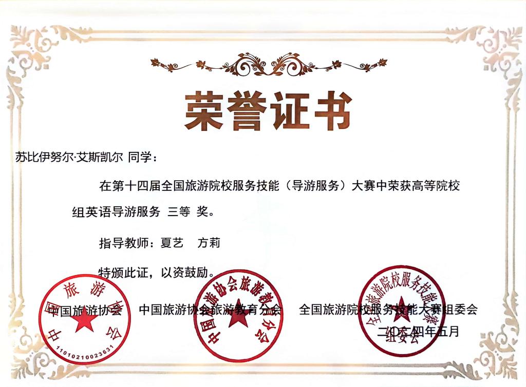 2024年5月23日至26日,第十四届全国旅游院校服务技能大赛在郑州举行。外语学院旅游英语专业2名同学参加了英语导游服务赛项,经过激烈的角逐,曹敏荣获二等奖,苏比伊努尔·艾斯凯尔荣获三等奖。