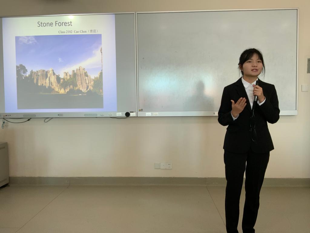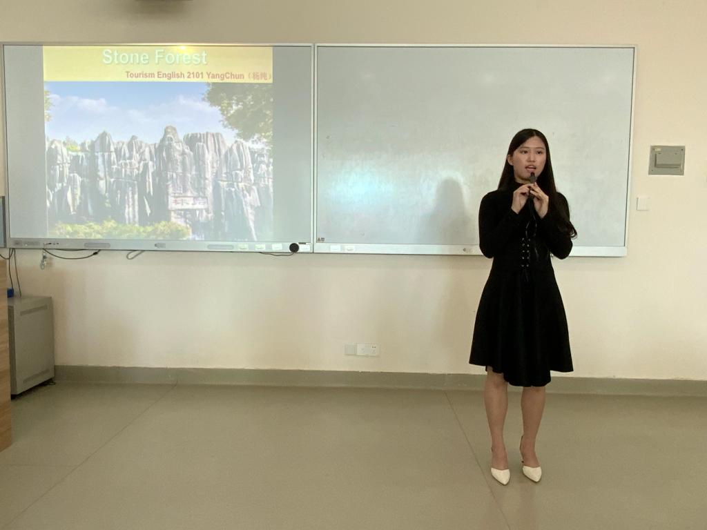 比赛伊始,外语学院副院长王永娟老师为本次比赛致辞。紧接着,19位选手围绕石林、丽江古城、和顺古镇、哈尼梯田、抚仙湖等景点展开英文导游词讲解。比赛中,参赛选手结合相应的景点图片,讲解熟练、流利,发音准确、清晰,举止大方得体、表情自然丰富。充分展现了同学们良好的英语素养和扎实的导游业务能力,在提高自身英语口语表达能力的同时,还带大家领略了云南美丽的自然风物和丰富的历史人文。比赛间隙,旅游英语专业杨敏、罗艳、曾娜娜、彭会琳、曹晨同学还带来了中英文歌曲串烧,展现了旅游英语专业学生多才多艺的一面。