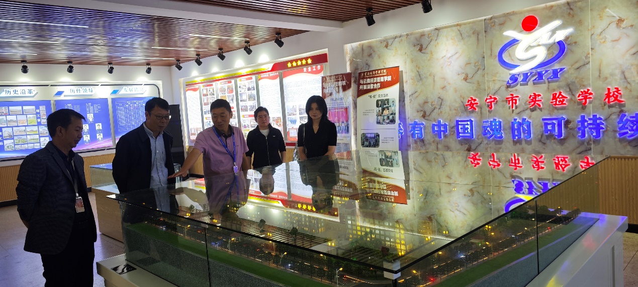 抵达安宁市实验学校后,安宁市实验学校对外语学院一行表示热烈欢迎,双方进行了热情友好的座谈,就进一步深入合作达成共识。外语学院陈奇书记对安宁市实验学校为实习学生提供的全方位支持表示衷心的感谢,并对安宁市实验学校严谨的教学态度、规范的管理体系以及认真负责的指导教师团队给予了高度评价。安宁市实验学校党委书记袁明欢、杜洪校长对外语学院以往实习生的表现给予了高度评价。安宁市实验学校作为一所高标准九年一贯制现代化学校,与多所高校建立了长期的合作关系,对大学生实习形成了完善的管理体系,配备了经验丰富的指导教师,学校通过量化考核、小组总结、培训、说课、比赛等形式,有效地锤炼了实习大学生的组织管理能力和与家长沟通的能力。安宁市实验学校教务主任唐老师详细介绍了实习生的培养计划,以及实习生在安宁市实验学校的生活安排,确保他们能够全心投入到实习中。