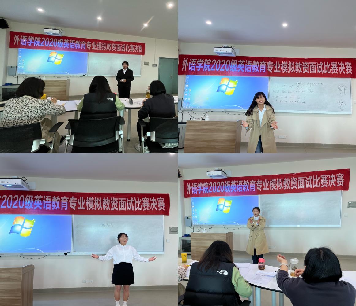 本次模拟教资面试比赛决赛分为考前抽题、依次备考、现场面试三个环节。进入考场前,考生提前抽取试讲题目进行20分钟的备课;正式面试流程包括:结构化问答、考生试讲、评委提问,时长20分钟,之后评委打分并现场公布结果。整个流程尽可能真实还原教师资格证考试的面试场景。6名选手通过热身、新知呈现、操练、应用、结课五个环节依次展示各自课堂内容,把在《小学英语教学设计》及《英语教师职业技能》等专业核心课上所学技能应用到了实践操作中。教师们对每个学生的面试表现进行了针对性评价与反馈。活动结束后,小学英语教育教研室主任蔡琳根据自身经验,针对考生们面试的技能、技巧,提出了可操作性的意见;强调了知识储备、讲课仪态、讲解方式等在教资面试中的重要性,并且对于考生的共性问题提出了多项改进意见:教学过程要突出重点,选择最精彩且最熟悉的部分,讲解得才会更加透彻、清晰;在讲解过程中要注意教姿教态,在板书期间要注意书写笔划;面试时要注意对时间的把控等。