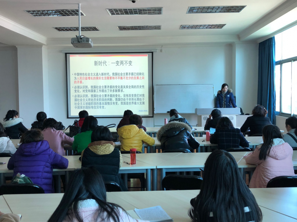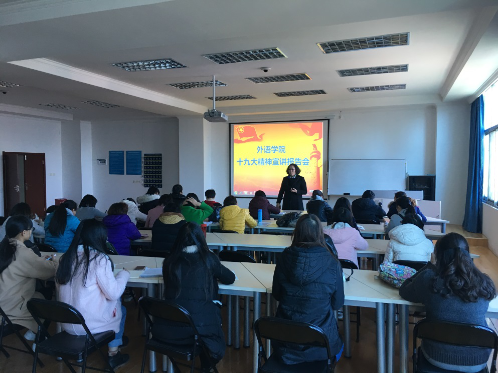 按照学校党委的统一部署,为深入学习宣传贯彻党的十九大精神,2017年12月22日中午,外语学院在图书馆四楼新情景实训室召开“十九大精神”宣讲报告会,外语学院全体党员、教职工及学生党员、入党积极分子参加了宣讲报告会。