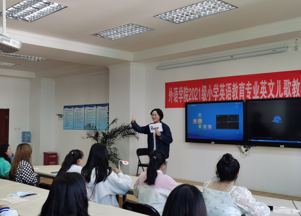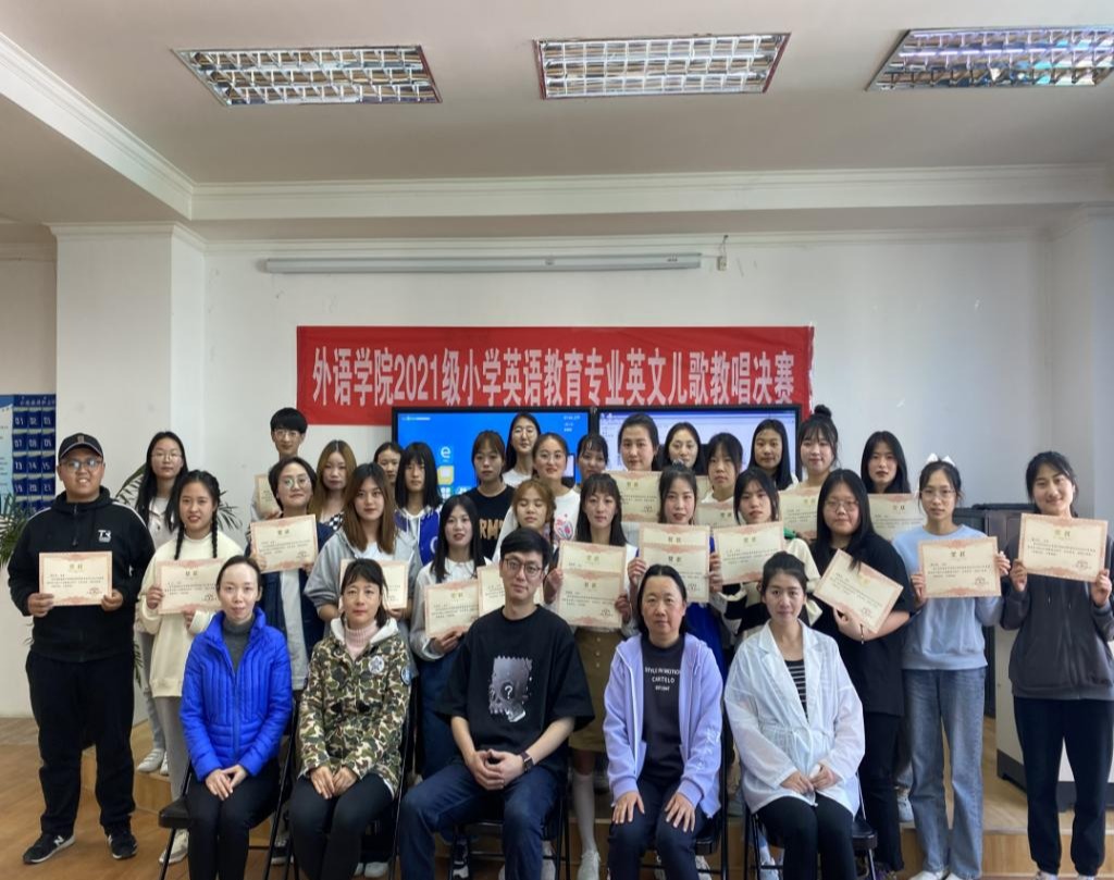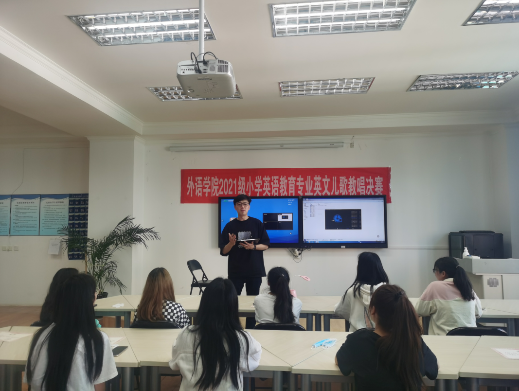 为不断完善外语学院“三全育人”体系,坚持课内与课外相结合,提升课堂育人和实践育人效果,让学生将学到的英语语音知识和基本教学技能应用到实践中,也为进一步丰富校园文化生活,给同学们提供一个展示自我的平台,提升学生的综合素质,2022年4月20日下午,外语学院迎来了精彩连连的“2021级小学英语教育专业英文儿歌教唱比赛”的总决赛。本次比赛面向2021级小学英语教育专业全体学生开展,初赛由各班自行选拔班级内的优秀作品,在同学们的积极踊跃参与下,共有31名同学的教唱作品进入初赛;复赛阶段,由英语教育教研室的教师们组成评审团队对初赛作品进行选拔,激烈角逐下,来自14各班级的14名同学脱颖而出,进入到决赛阶段,他们为我们展示了一场英文儿歌教唱的盛宴。