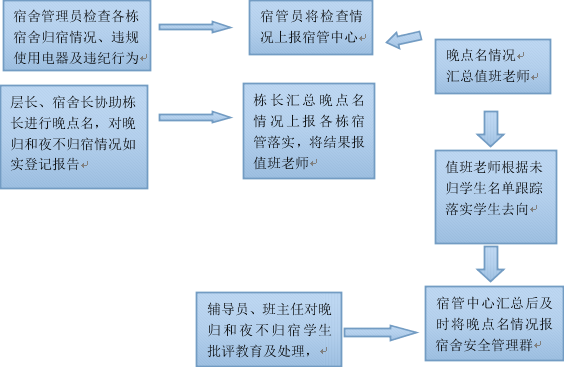 1.宿管员和栋长同步进行晚点名,宿管员要对楼长统计的情况进行逐一核实,对晚归学生进行再落实。对学生违规使用电器或出现违纪行为及时处理。