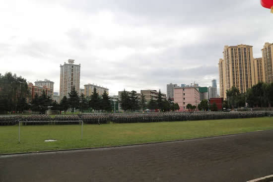 全体新生在运动场上集结完毕,准备接受学院领导检阅。