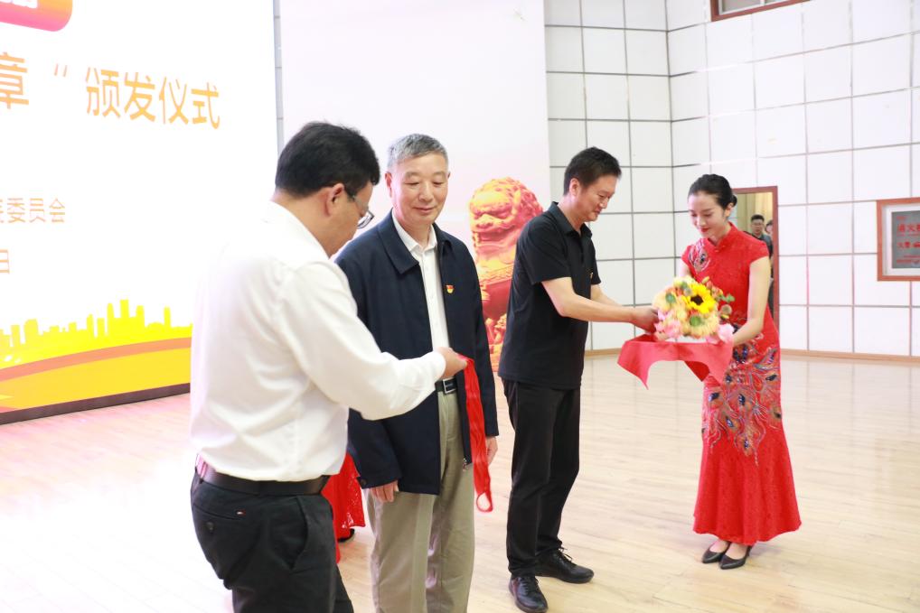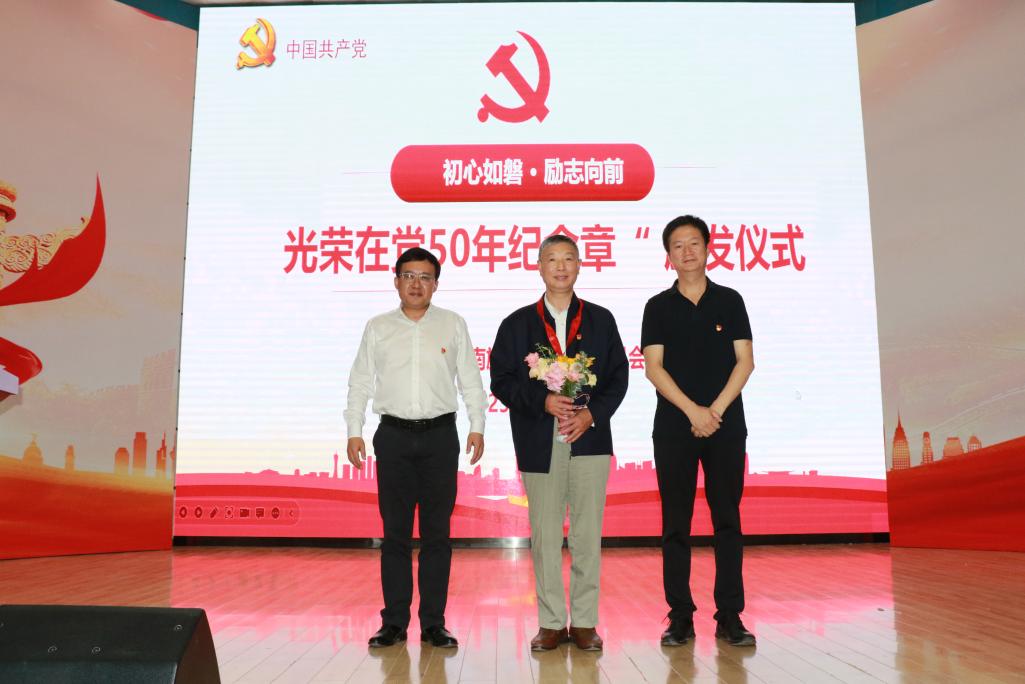 学院党委书记王翔,学院党委副书记、院长蔡冰同志为荣获“光荣在党五十年”老党员代表袁成明同志颁发纪念章,并献上鲜花。