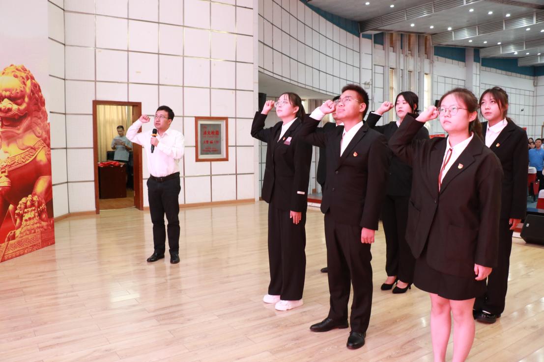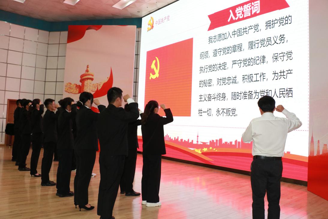 王翔同志带领新党员入党宣誓,全体党员面对鲜红的党旗举起右手,重温入党誓词。