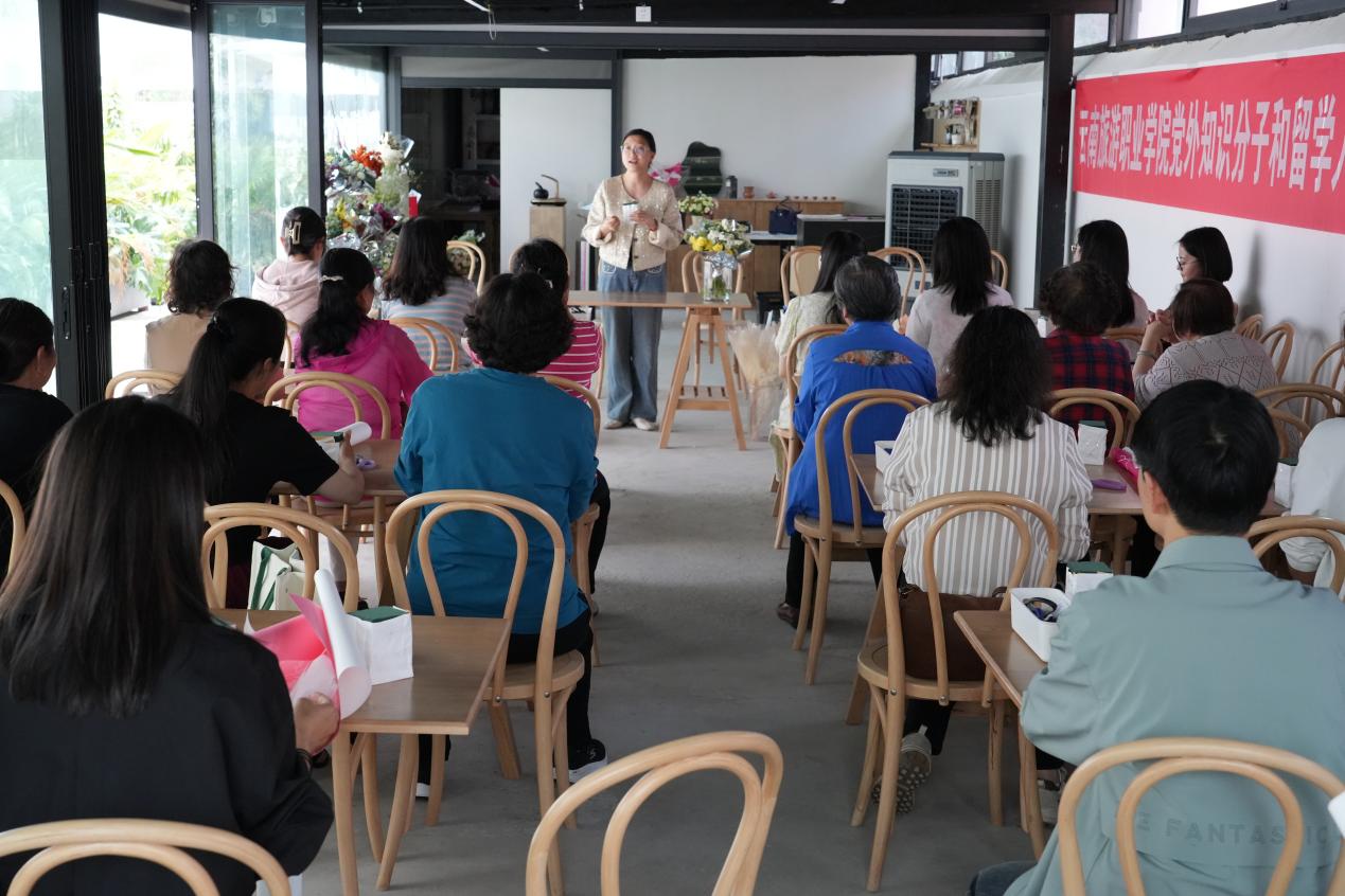 5月11日下午,一场以“花漾时光 致敬母爱”为主题的花艺活动在酒店管理学院产教融合虚拟仿真实训基地花艺实训室成功举办。此次活动由学院党外知识分子和留学人员联谊会精心组织,旨在通过花艺活动向伟大的母爱致敬,同时促进教职工之间的交流与互动。活动由联谊会副会长伍乐平主持。