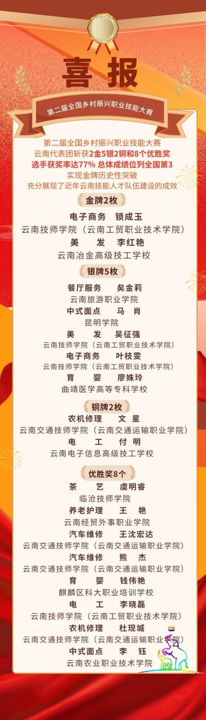 5月8日至5月10日,第二届全国乡村振兴职业技能大赛在贵州省贵阳市举办。bevictor伟德国际1946官网酒店管理学院张艳老师和矣金利同学代表云南省参加了餐厅服务赛项的比拼,最终矣金莉斩获学生组银牌,取得了优异成绩。
