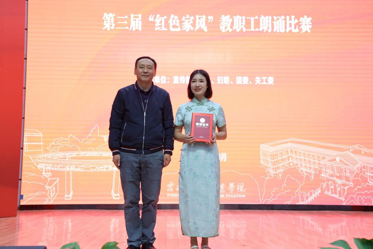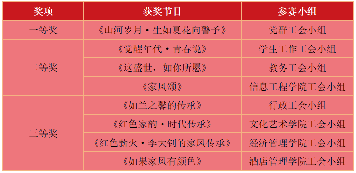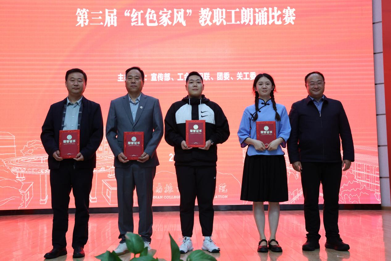 经过参赛教职工的精彩角逐、评委们的客观评判,本次朗诵比赛最终评选出一等奖1名、二等奖3名、三等奖4名。党群工会小组拔得头筹,荣获本次比赛一等奖。校领导对获奖的工会小组表示祝贺并为其颁发获奖证书。