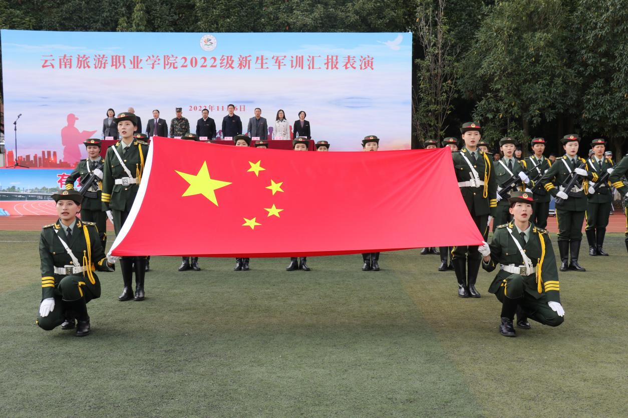 伴随着雄壮的国歌声,2022级新生军训汇报表演拉开帷幕。全体人员肃立齐唱国歌,气氛肃静而庄严。秋风习习、阳光灿烂、绿草茵茵的田径场上,全体新生意气风发,神采飞扬。